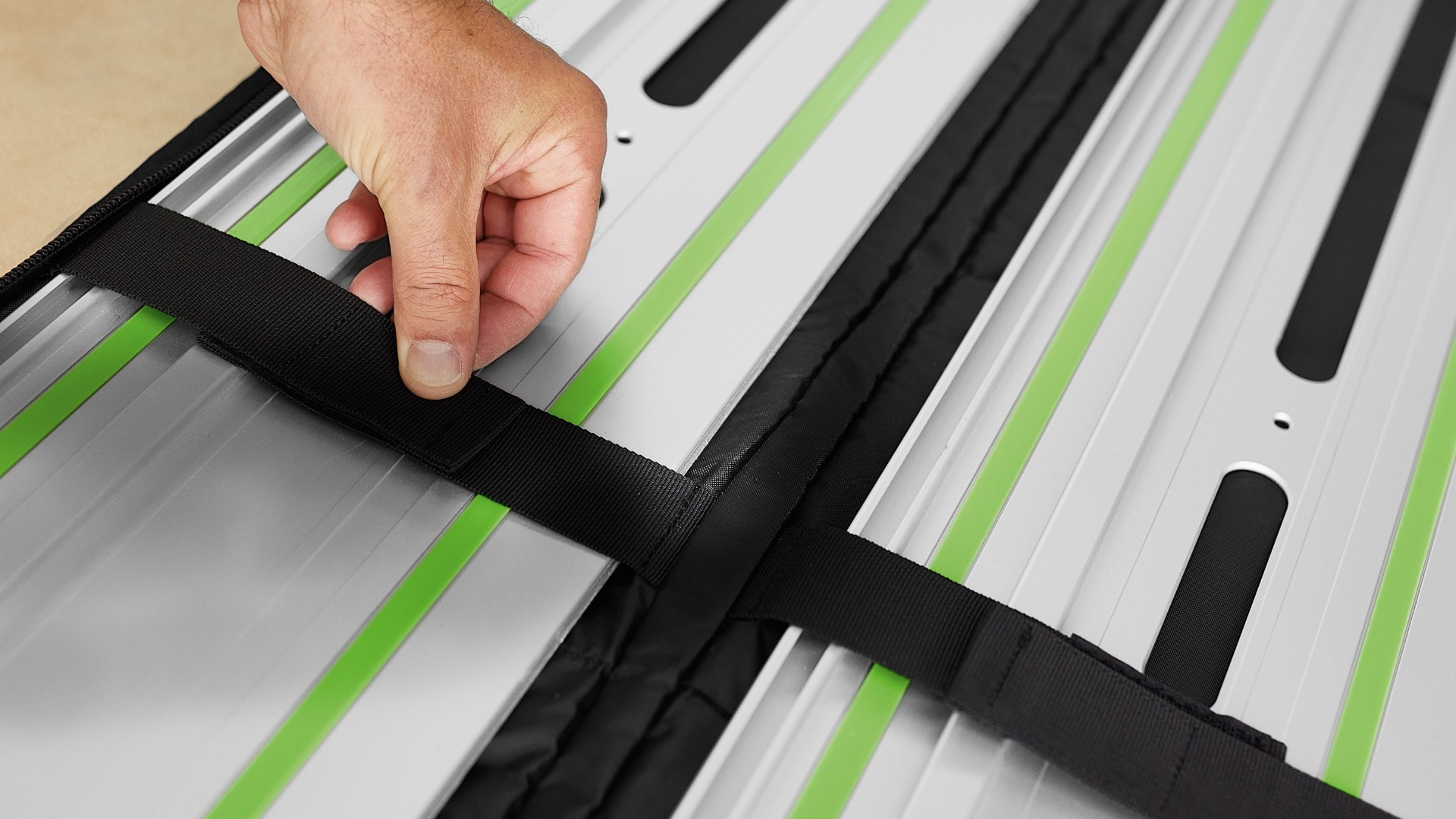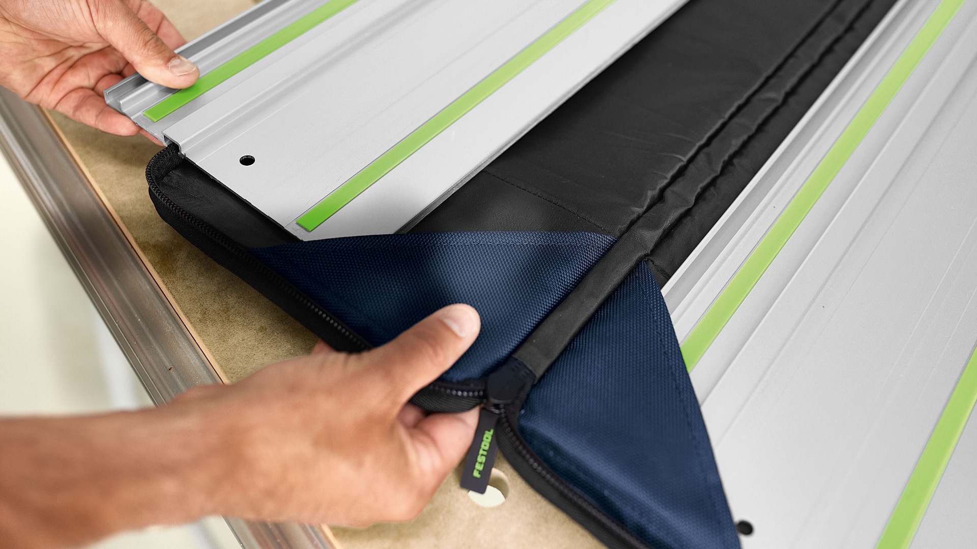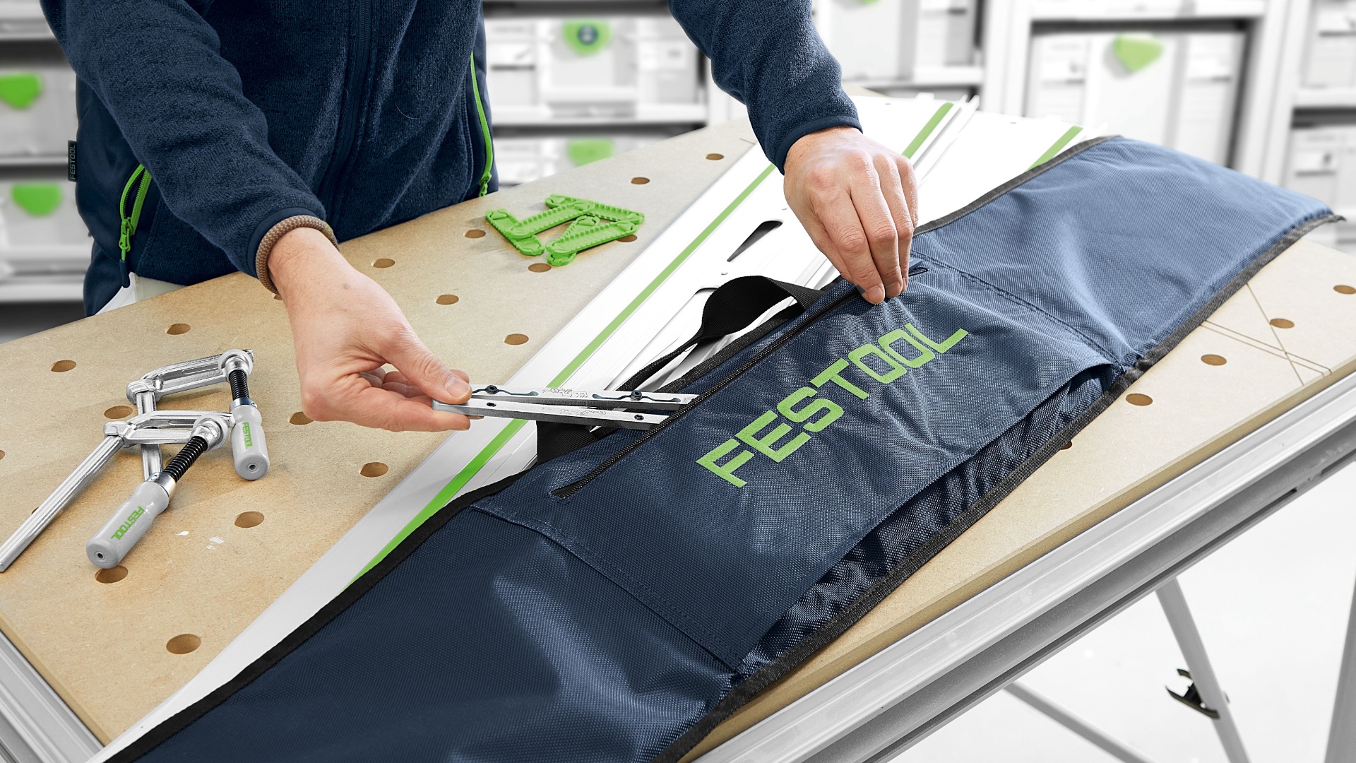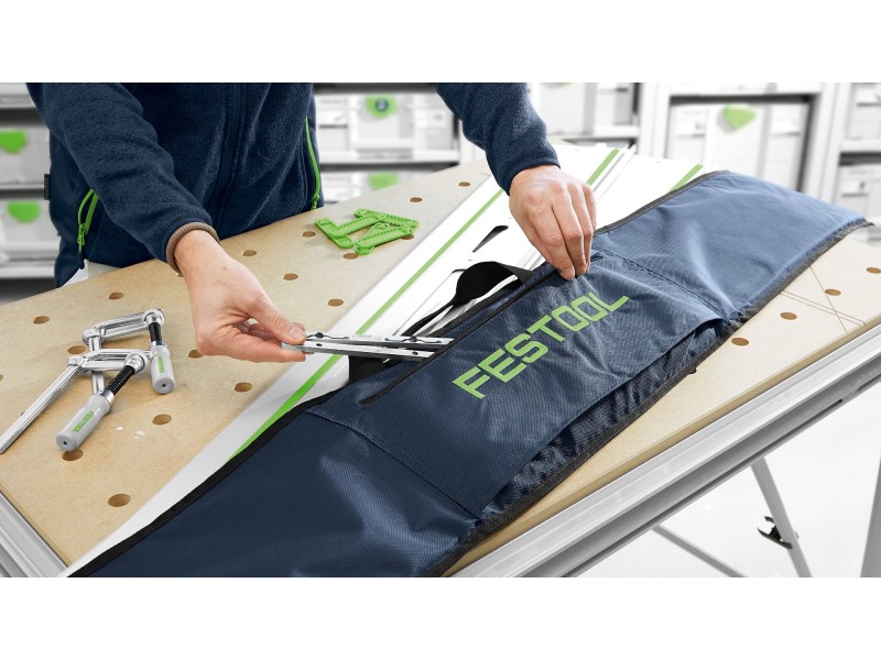С сумкой для направляющих шин направляющие надёжно защищены, удобно транспортируются и аккуратно хранятся. Сумки имеют один большой основной отсек, в котором можно разместить одну или две направляющие шины длиной до 1900 мм. Дополнительно есть ещё один карман, в котором можно разместить аксессуары, такие как соединители, струбцины или угловой упор FS-WA/90°.