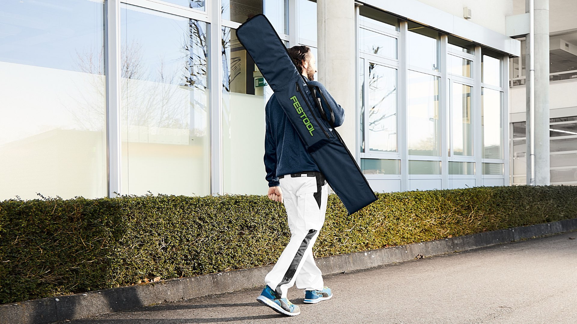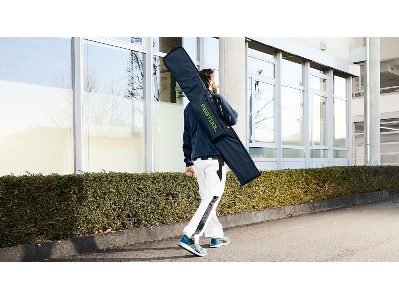 С сумкой для направляющих шин FS-BAG направляющие хранятся аккуратно, защищены и удобно транспортируются. Сумка имеет один большой основной отсек, в котором можно разместить одну или две направляющие шины длиной до 1400 мм. Дополнительно есть ещё один карман, в котором найдут место соединители и струбцины или угловой упор FS-WA/90°.