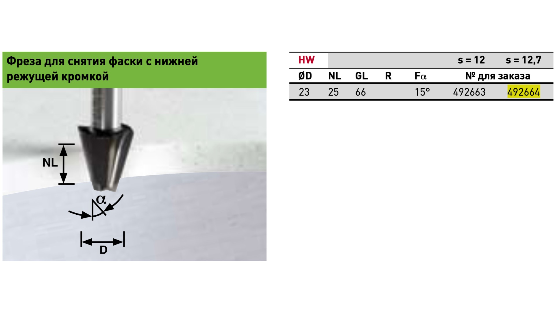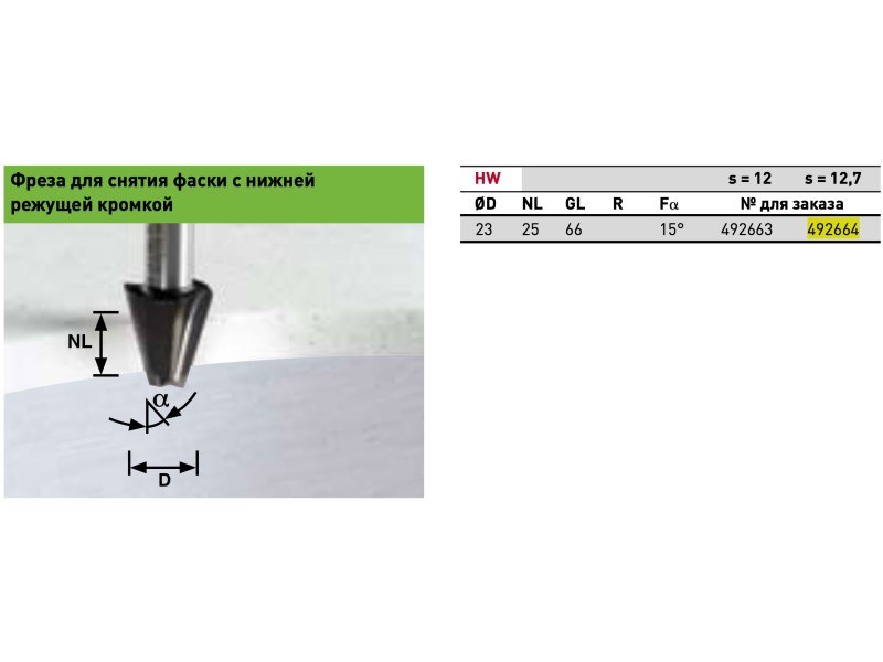 Фреза для снятия фаски с нижней режущей кромкой Festool HW D23/NL25/GL66/15° ss S12,7