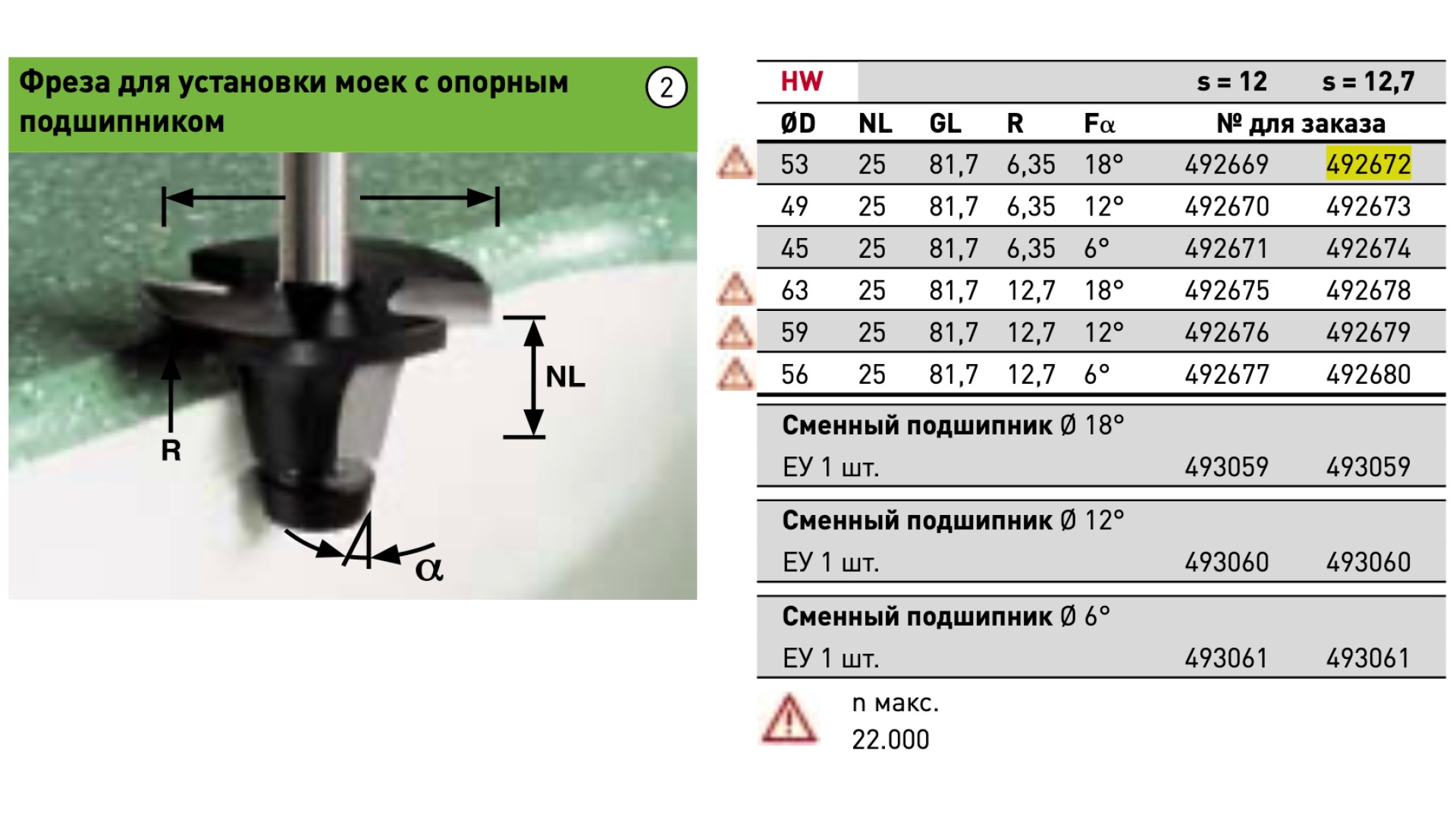 Фреза для установки моек с опорным подшипником Festool HW D 53 / NL 25 / GL 81,7 / R 6,35