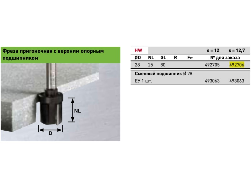 Фреза пригоночная с верхним опорным подшипником Festool HW D28/NL25/GL80 ss S12,7
