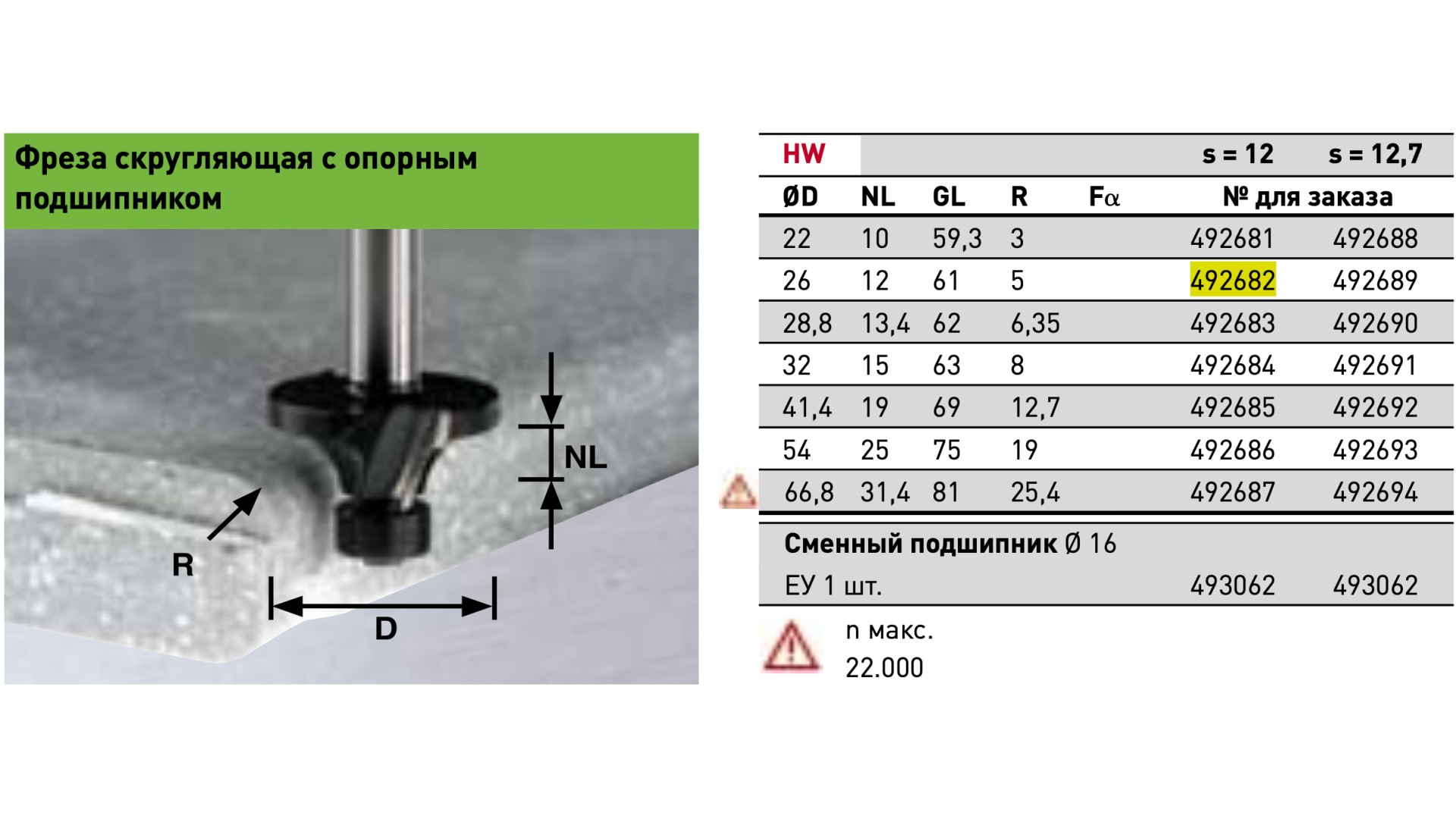 Фреза скругляющая с опорн. подшипником Festool HW R5/D26 ss S12
