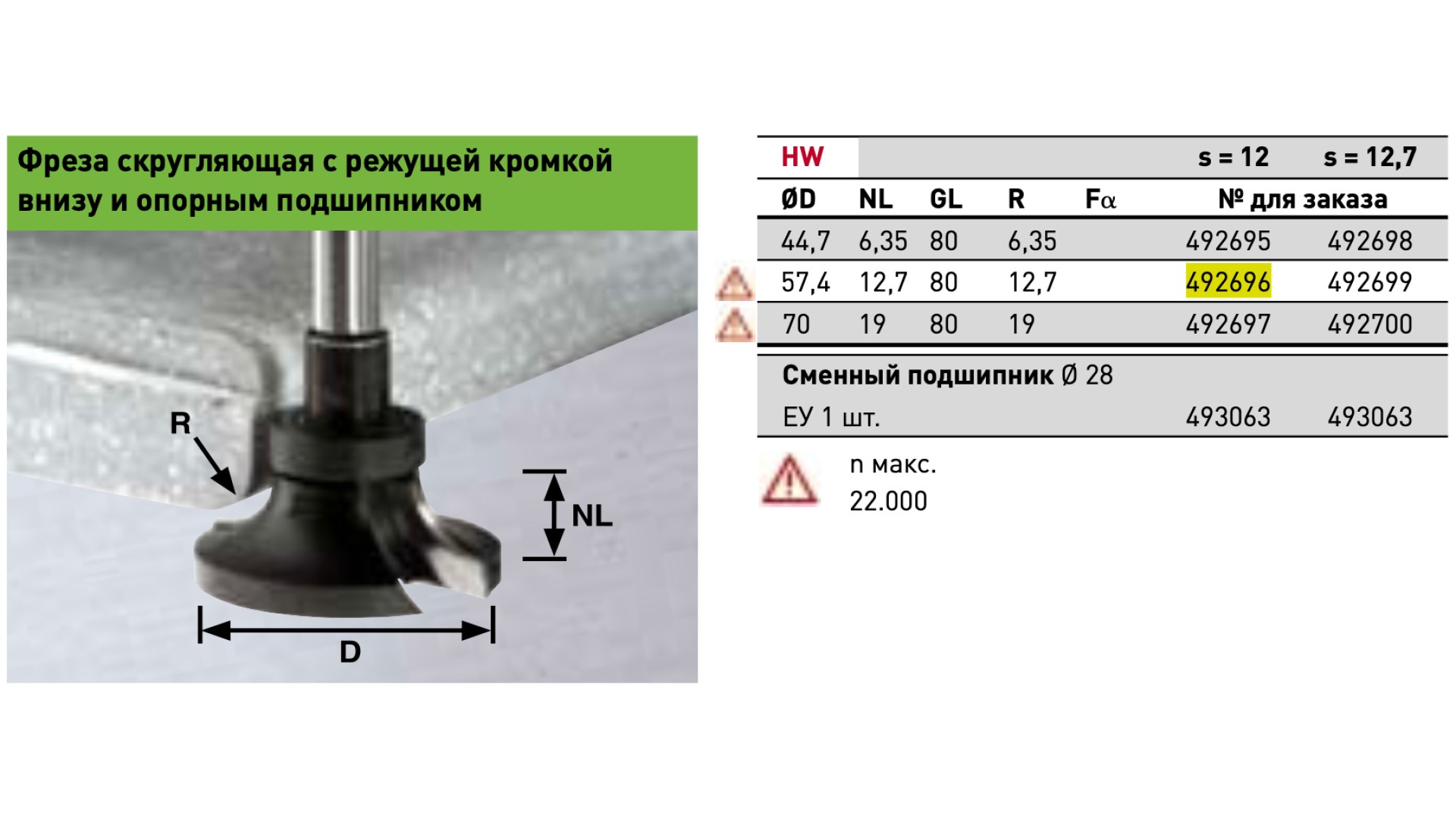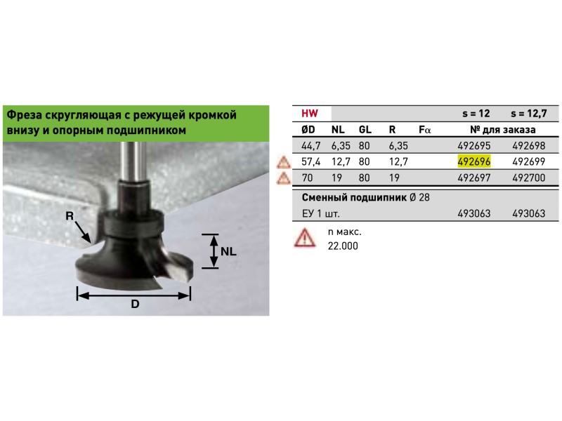 Фреза скругляющая с режущей кромкой внизу и опорным подшипником Festool HW R12.7/D57.4BN ss S12