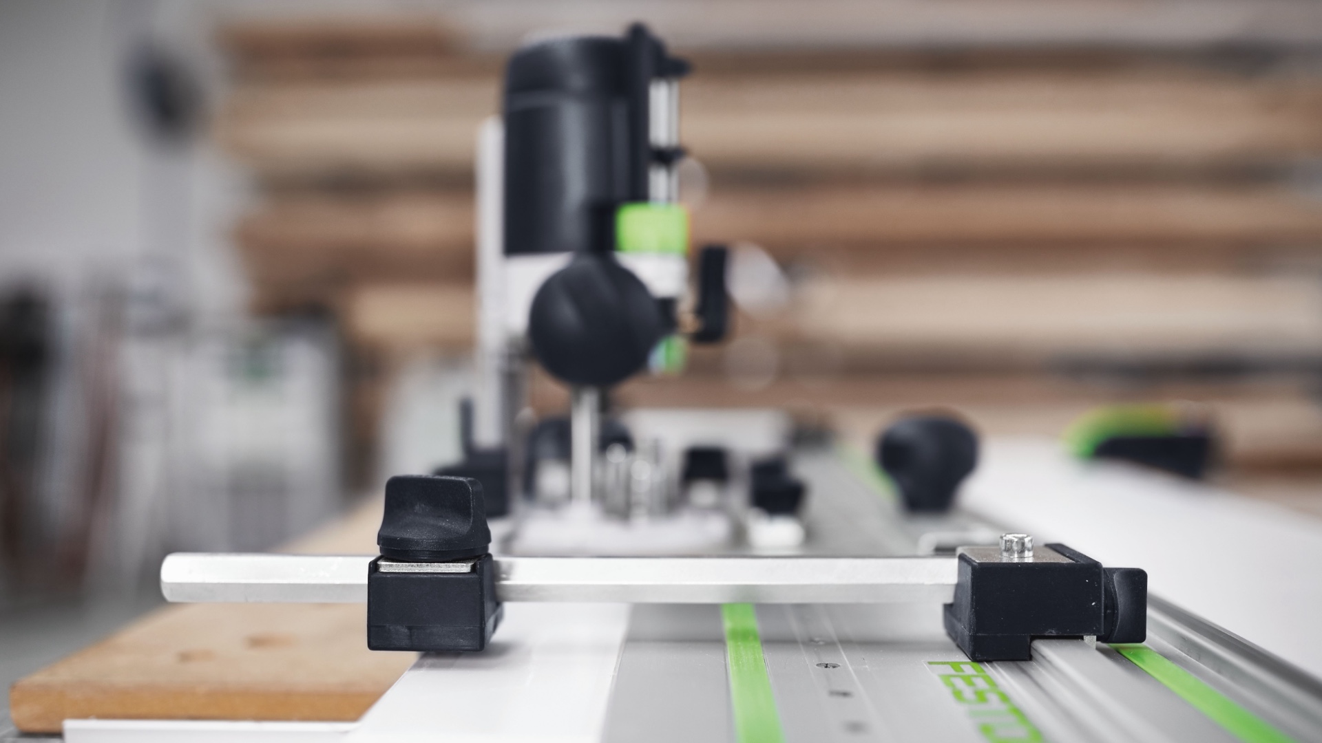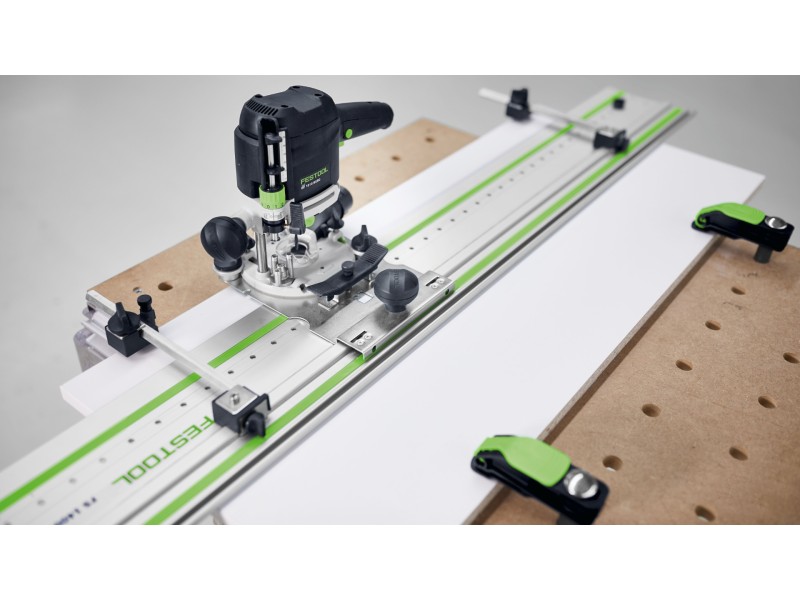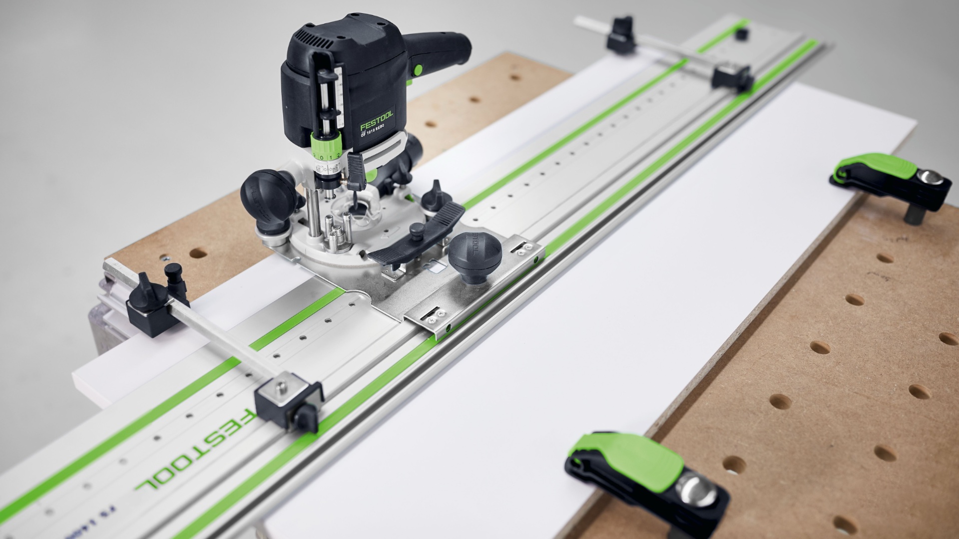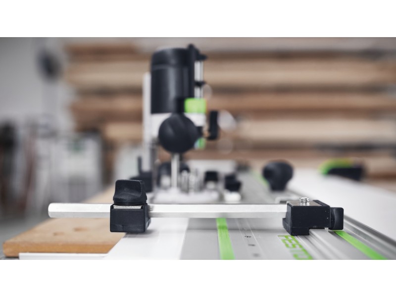 - Направляющая шина LR 32 быстро и параллельно выравнивается с помощью двух боковых упоров, которые с помощью бегунков-упоров позиционируются на заготовке и направляющей шине