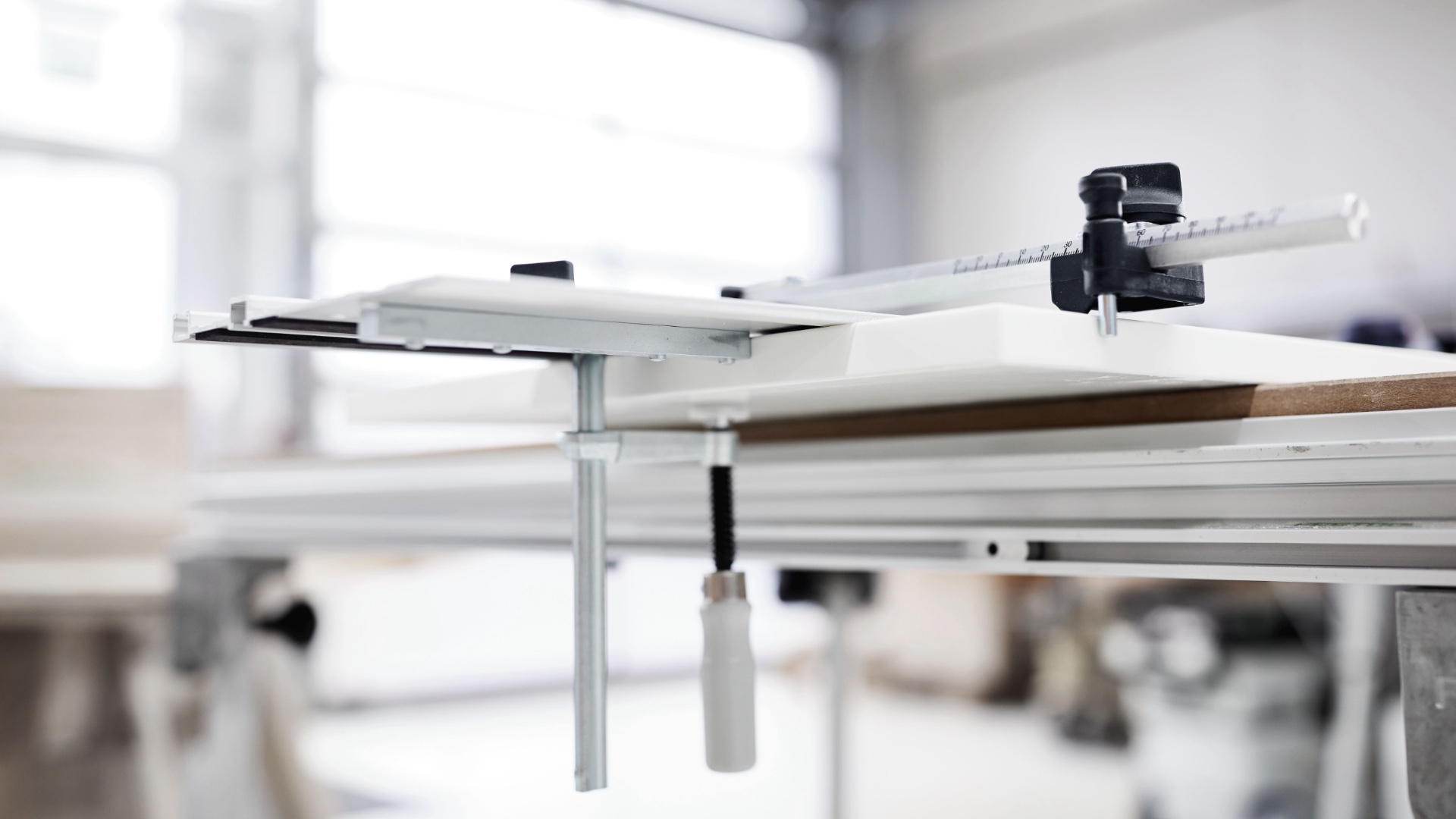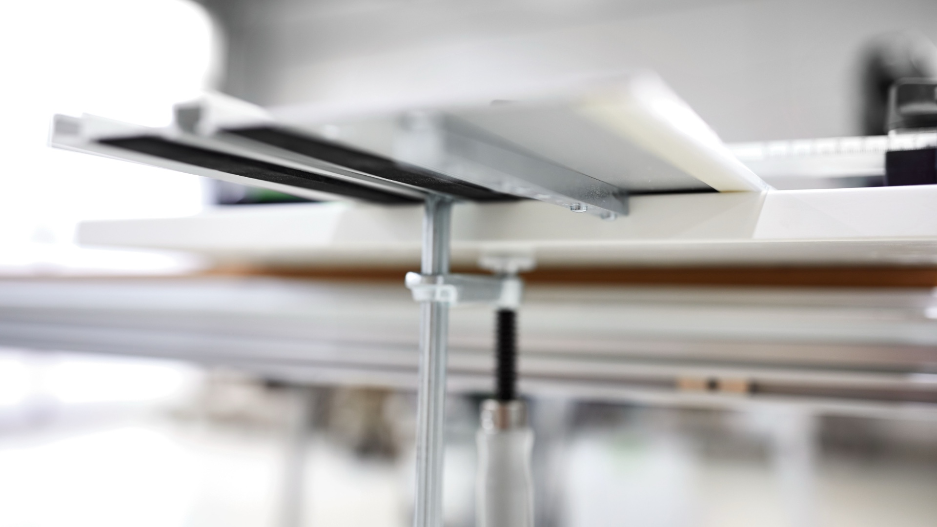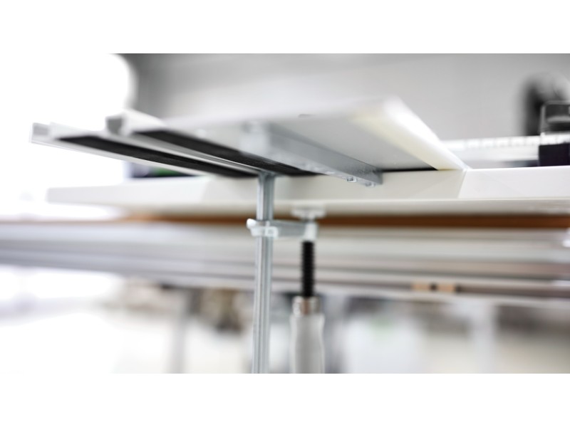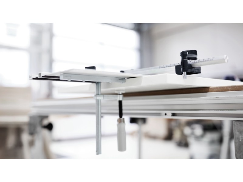 - Направляющая шина LR 32 быстро и параллельно выравнивается с помощью двух боковых упоров, которые с помощью бегунков-упоров позиционируются на заготовке и направляющей шине