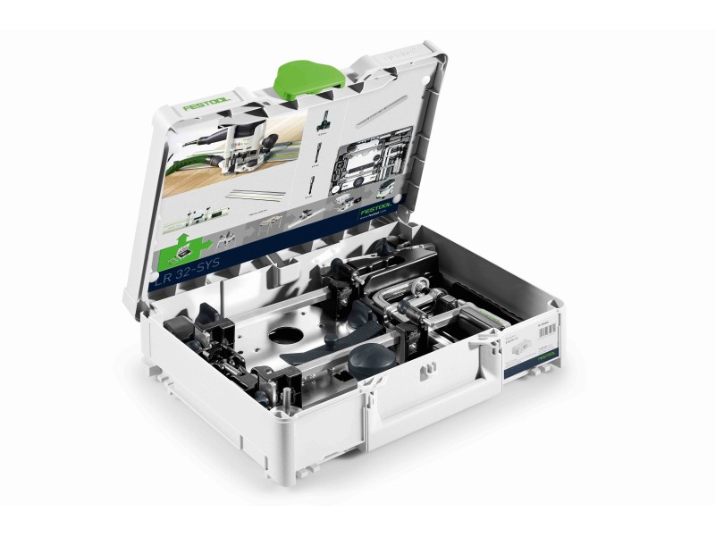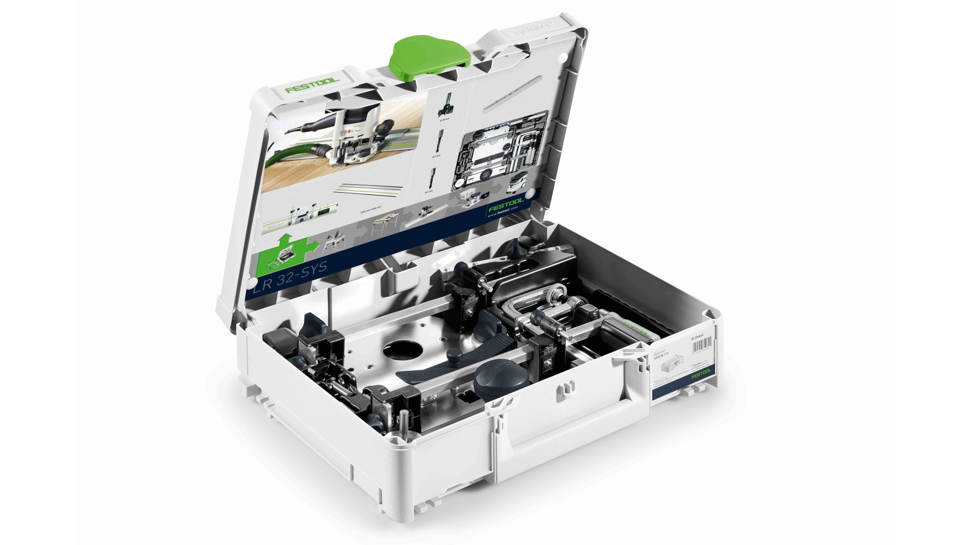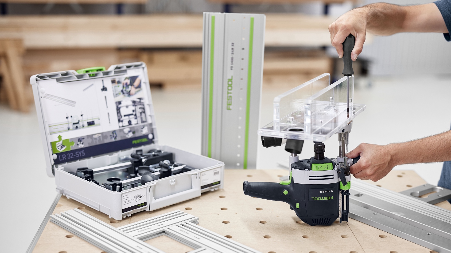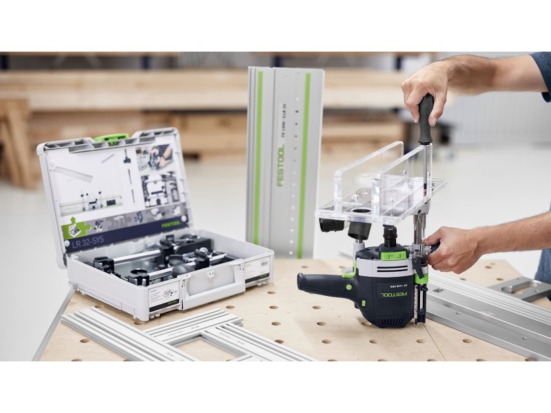 - С системой LR 32 — состоящей из направляющей шины FS 1400/2-LR 32 или FS 2424/2-LR 32 и набора для сверления рядов отверстий — можно с фрезером Festool сверлить точные ряды отверстий с шагом 32 мм