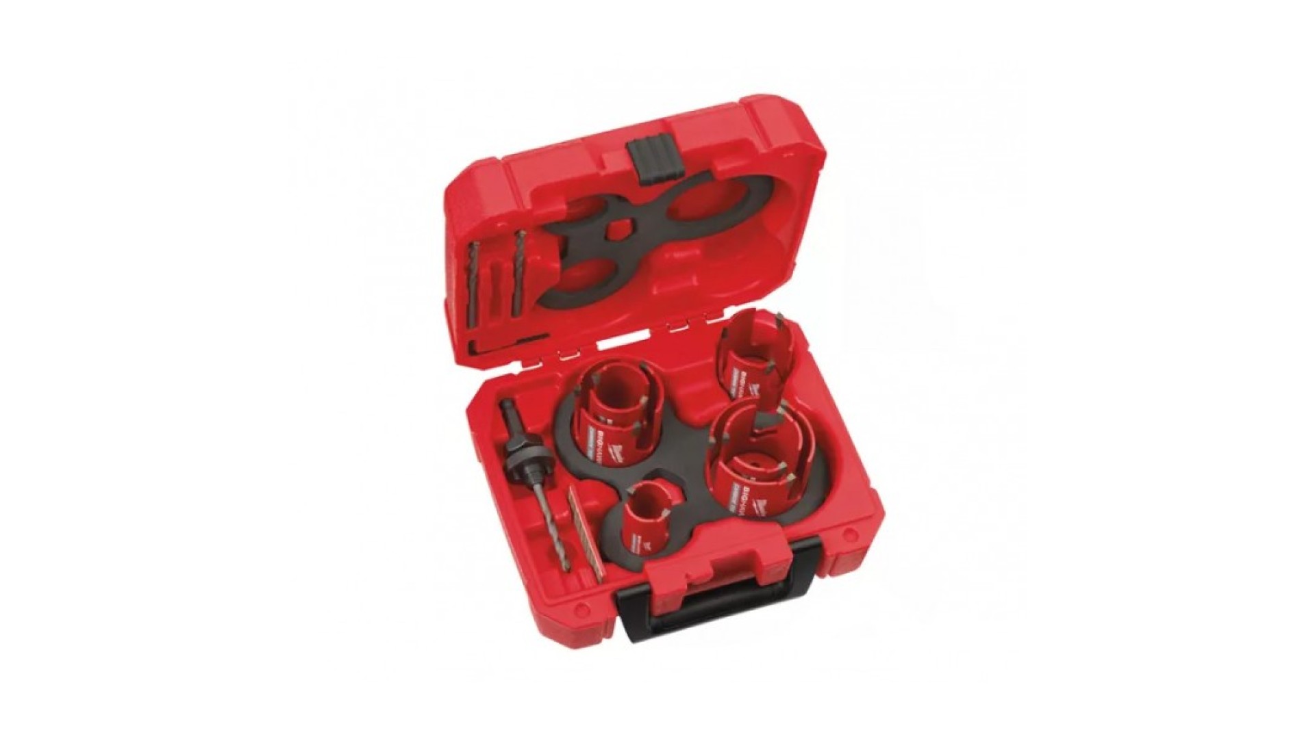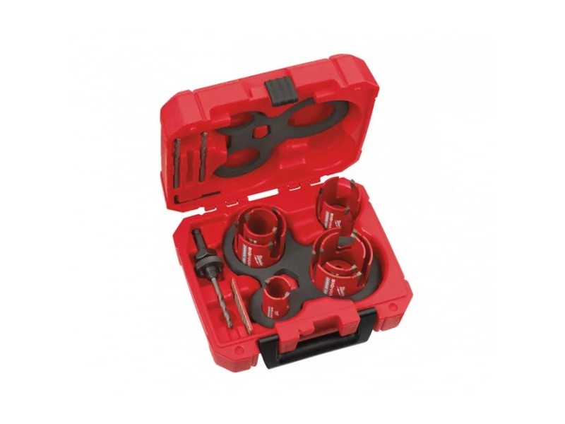 BIG HAWG™ коронки: 35, 44, 51, 57, 68, 76 мм. 1 x хвостовик с направляющим сверлом. 2 x направляющих сверла. 1 x алмазный напильник. 1 x шестигранный ключ