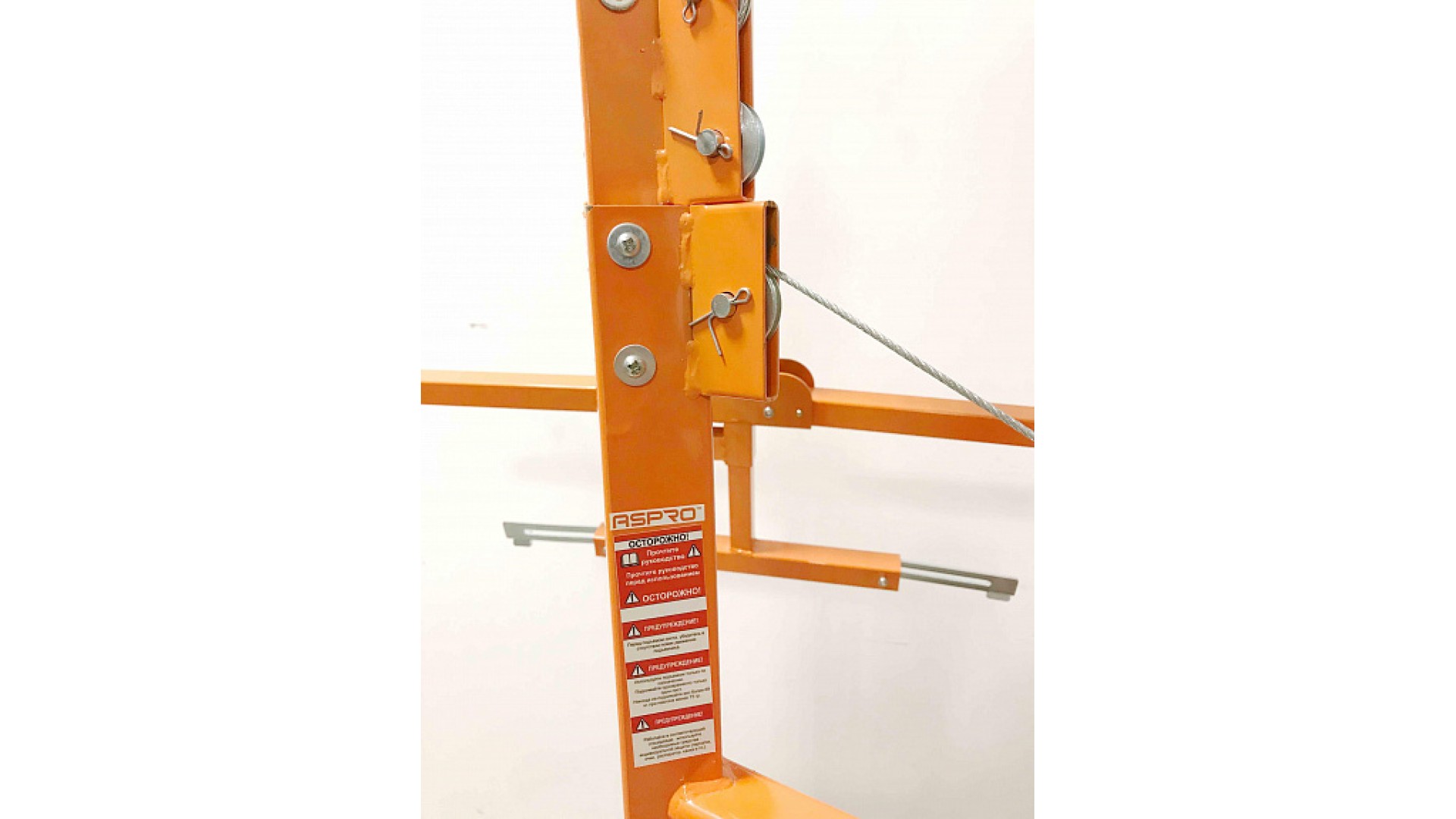 Подъемник для гипсокартона ASPRO имеет простой механизм подъема/спуска поворотной люльки, достаточно просто крутить рукоятку по часовой стрелке для подъема или против часовой для спуска. Для дополнительной безопасности подъемный редуктор имеет стопор, который обеспечивает дополнительную механическую защиту от самопроизвольного опускания телескопической секции.