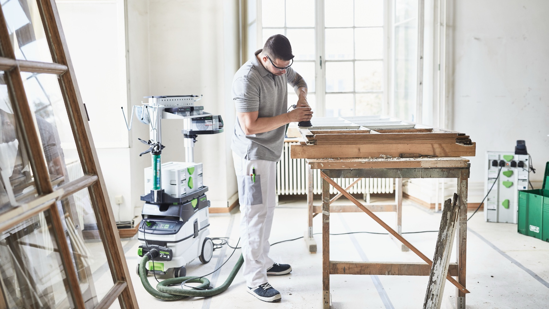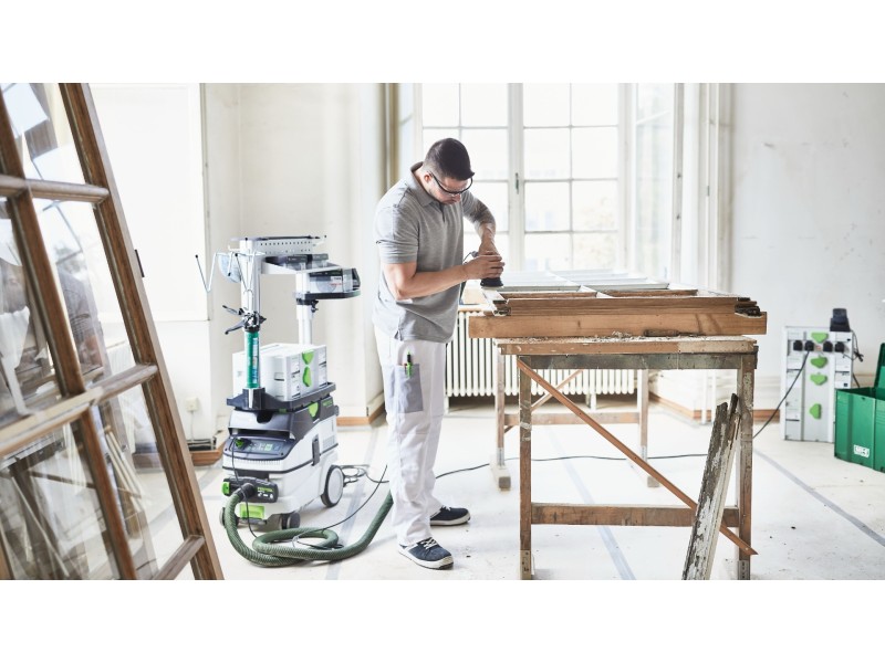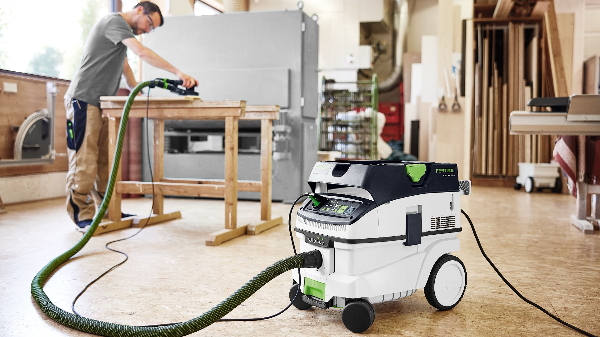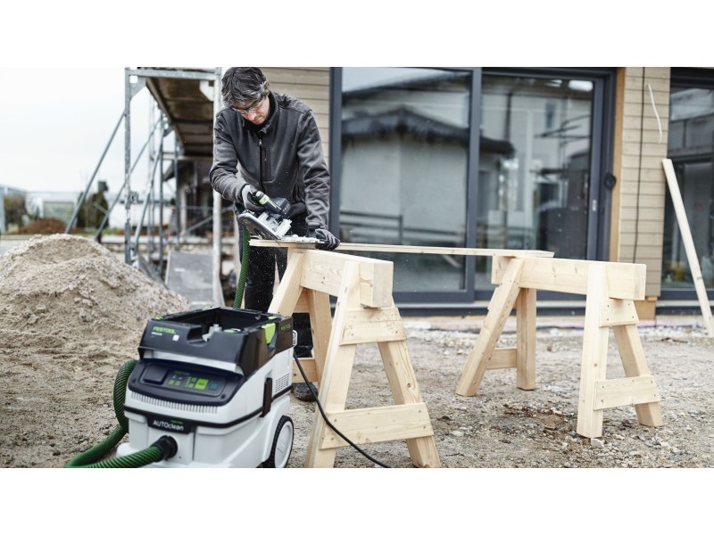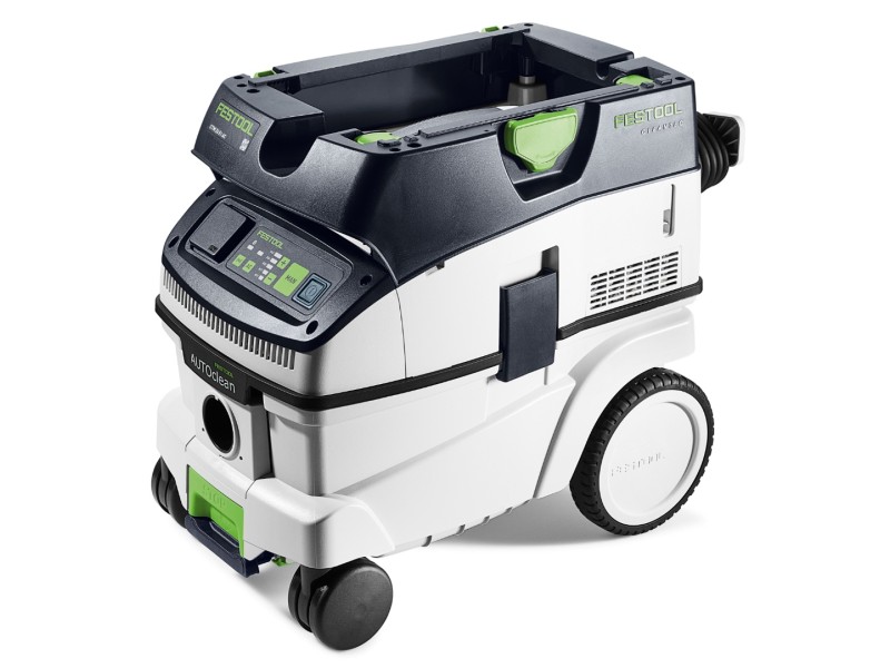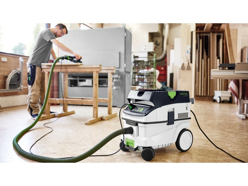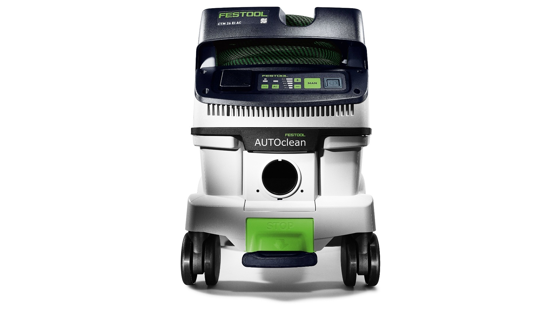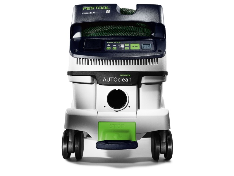 CLEANTEC CTM 26 EI AC выделяется более эффективной, по сравнению с предшественником, автоматической очисткой основного фильтра AUTOCLEAN. Это обеспечивает стабильно высокую силу всасывания, более длительные рабочие интервалы и увеличенный срок службы фильтра при меньших затратах на обслуживание. Сенсорное управление даёт интуитивный контроль пылесоса. Постоянно установленный интерфейс Bluetooth® позволяет автоматически запускать пылесос от аккумуляторного инструмента Festool или опционного пульта ДУ. Пылесос также можно связать с приложением Festool App, где, например, настраиваются интервалы очистки. Гладкий антистатический всасывающий шланг удобно убирается в интегрированный отсек для шланга.