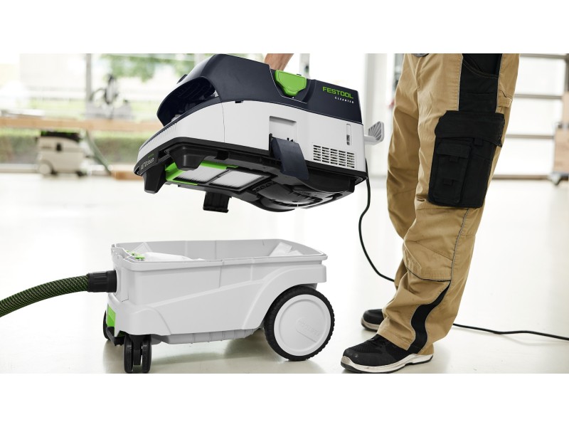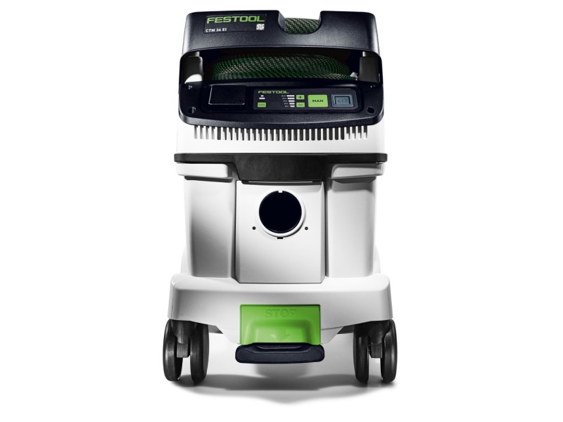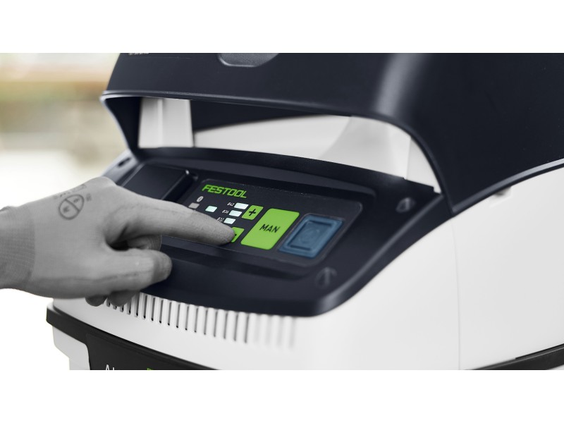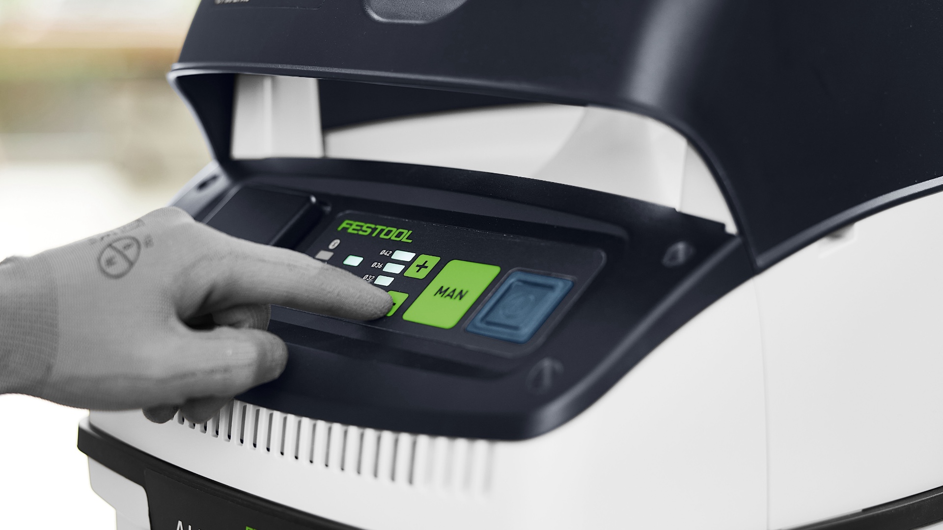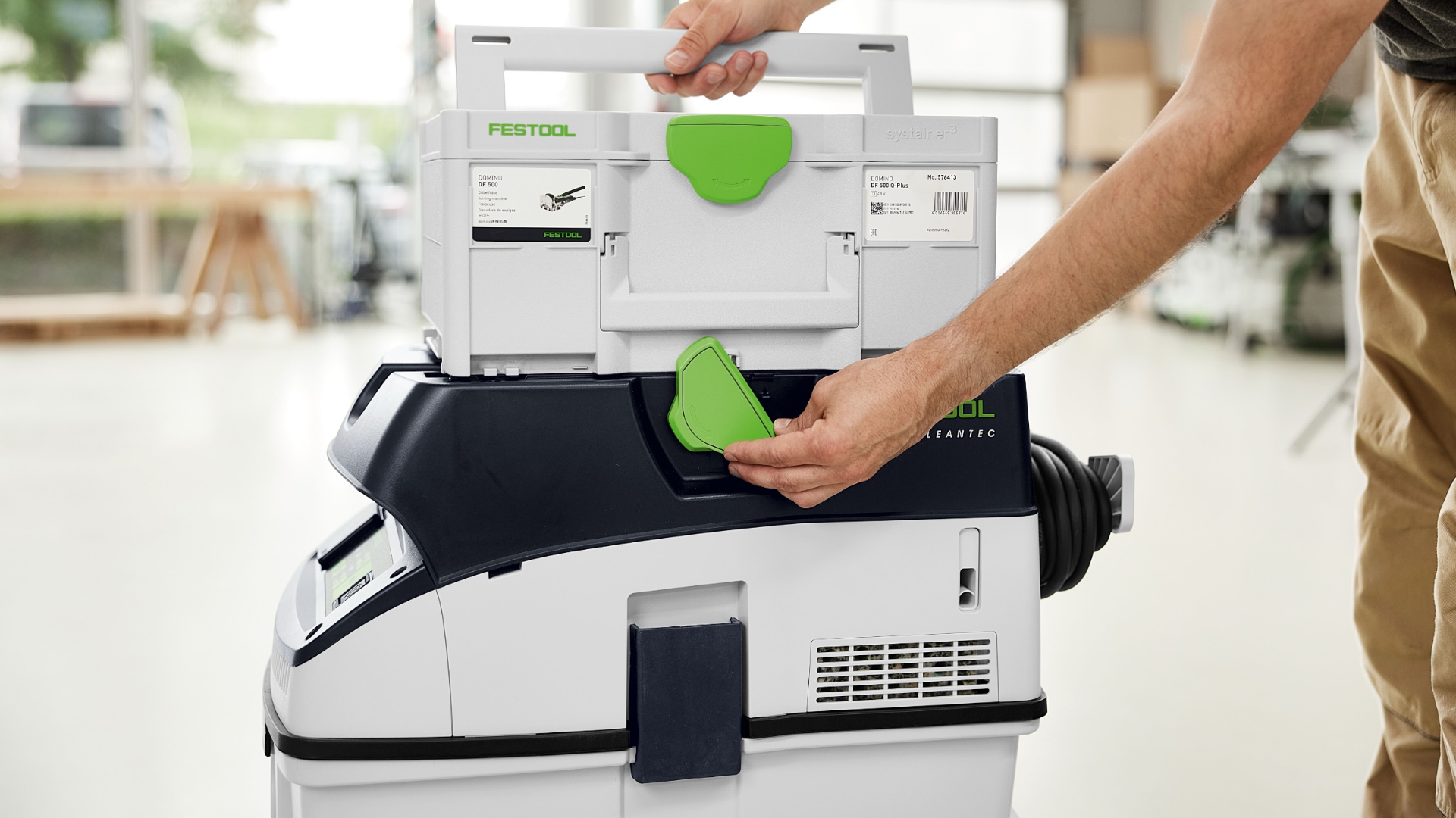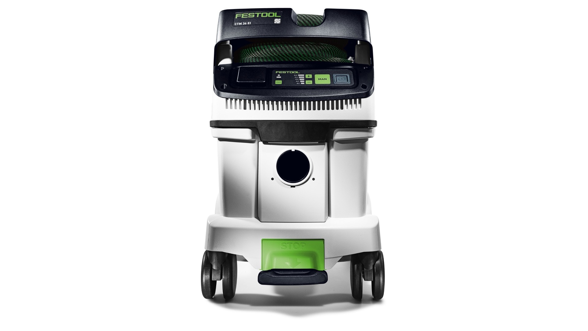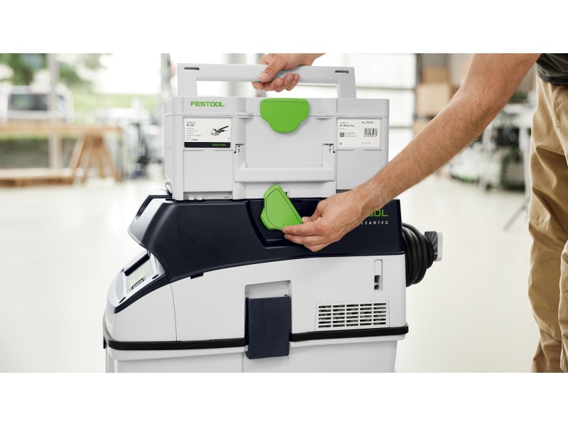 CLEANTEC CTM 36 EI с объёмом контейнера 36 л предлагает большой запас объёма при компактных габаритах. Сенсорное управление обеспечивает интуитивный контроль пылесоса. Встроенный интерфейс Bluetooth® позволяет автоматически запускать пылесос от аккумуляторного инструмента Festool или опционального пульта ДУ, а также подключать его к приложению Festool App. Гладкий антистатический шланг удобно убирается в интегрированный отсек для шланга. Благодаря системе T-LOC можно быстро состыковать систейнеры, предотделитель или Workcenter. Так пылесос становится центром всей системы.