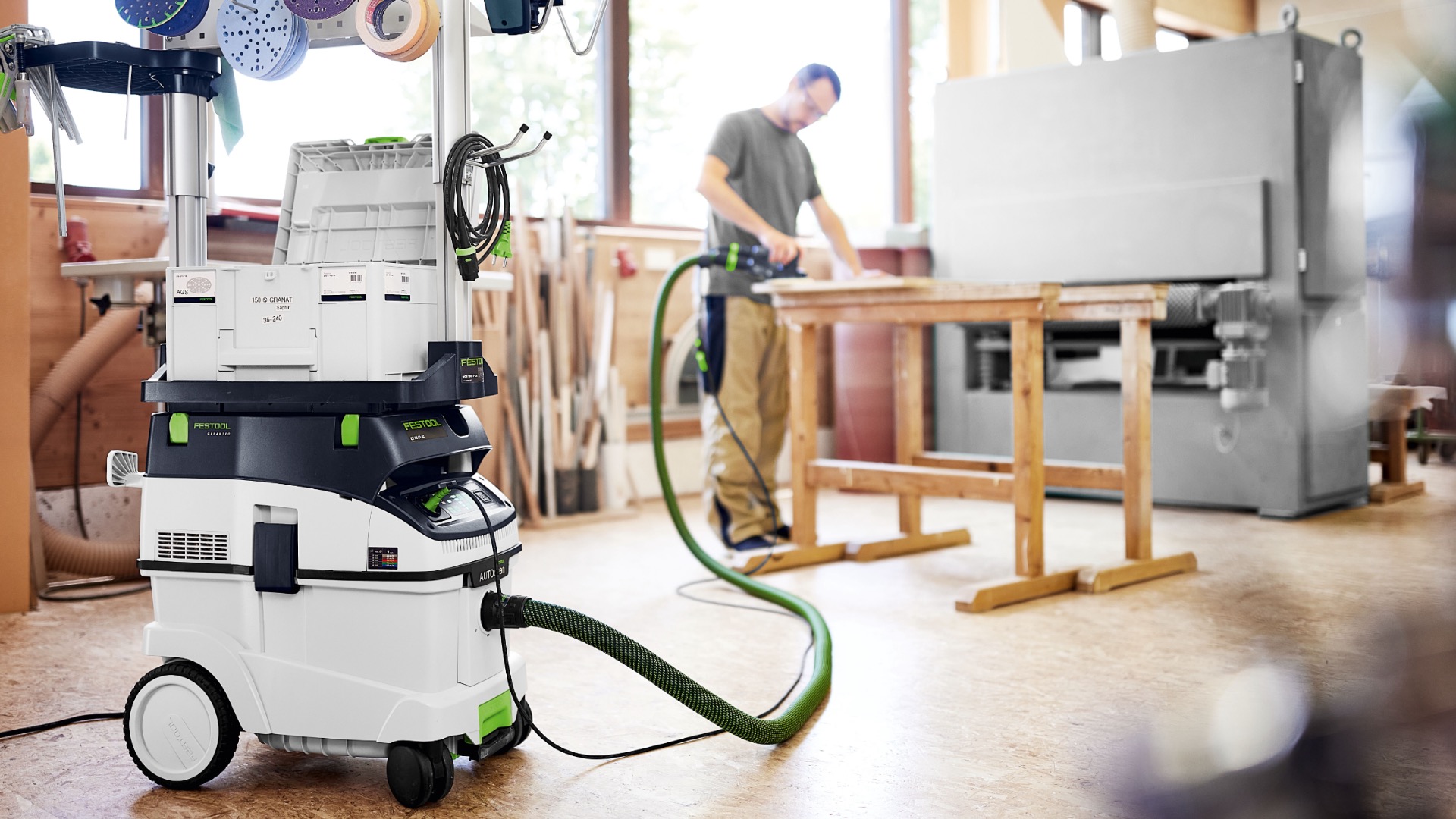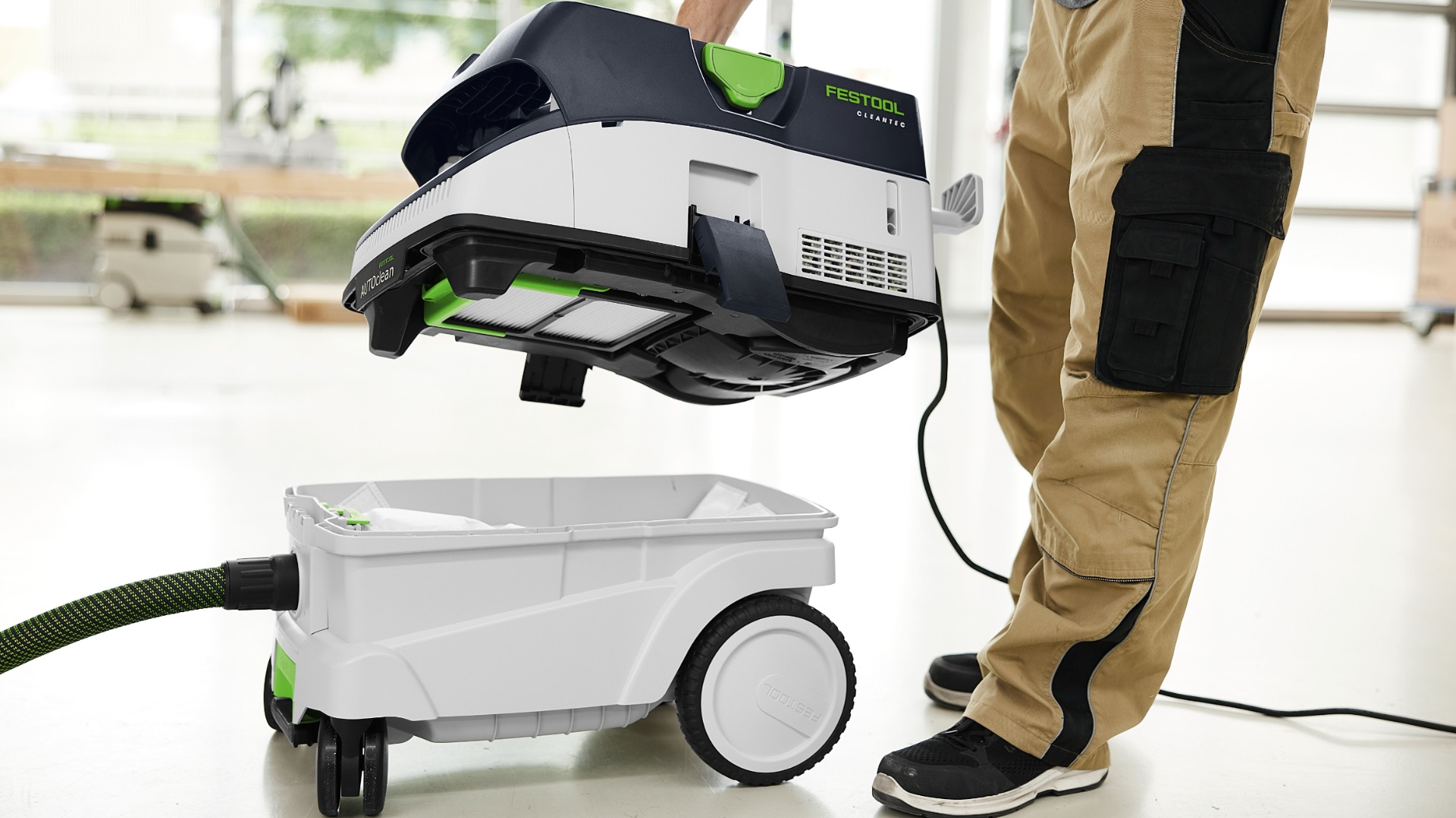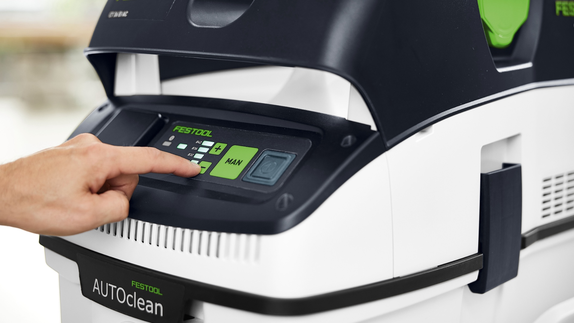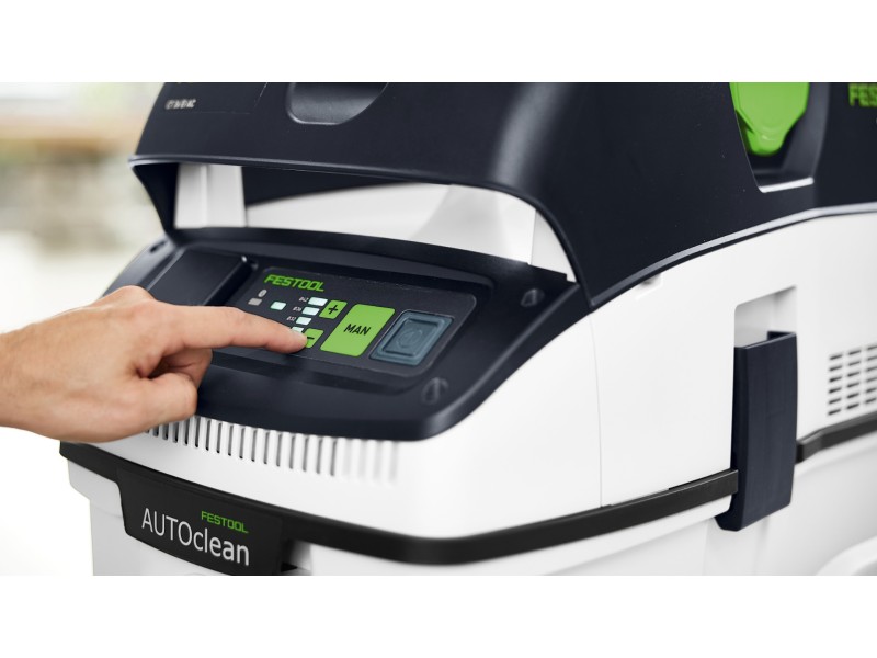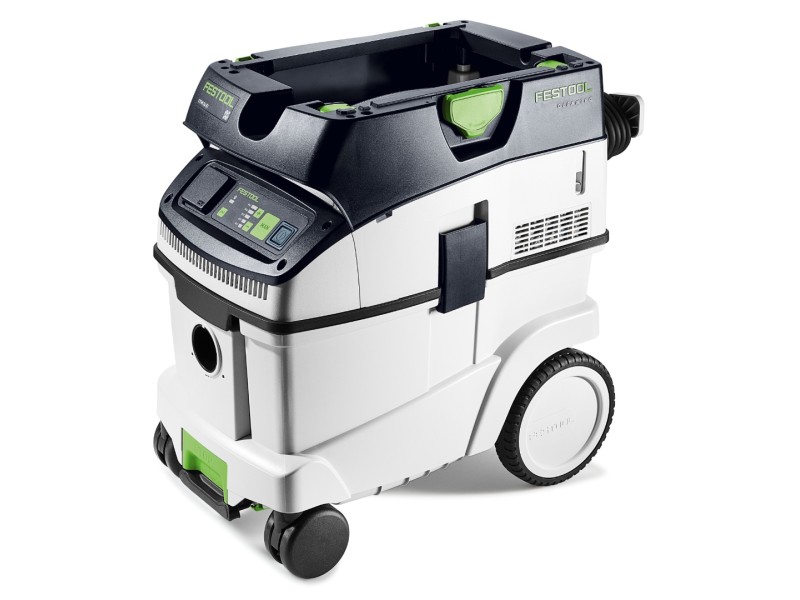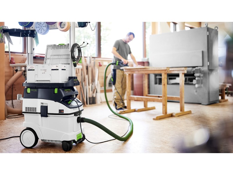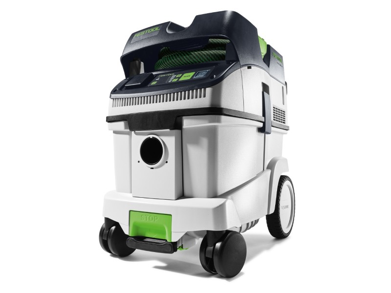 CLEANTEC CTM 36 EI с объёмом контейнера 36 л предлагает большой запас объёма при компактных габаритах. Сенсорное управление обеспечивает интуитивный контроль пылесоса. Встроенный интерфейс Bluetooth® позволяет автоматически запускать пылесос от аккумуляторного инструмента Festool или опционального пульта ДУ, а также подключать его к приложению Festool App. Гладкий антистатический шланг удобно убирается в интегрированный отсек для шланга. Благодаря системе T-LOC можно быстро состыковать систейнеры, предотделитель или Workcenter. Так пылесос становится центром всей системы.