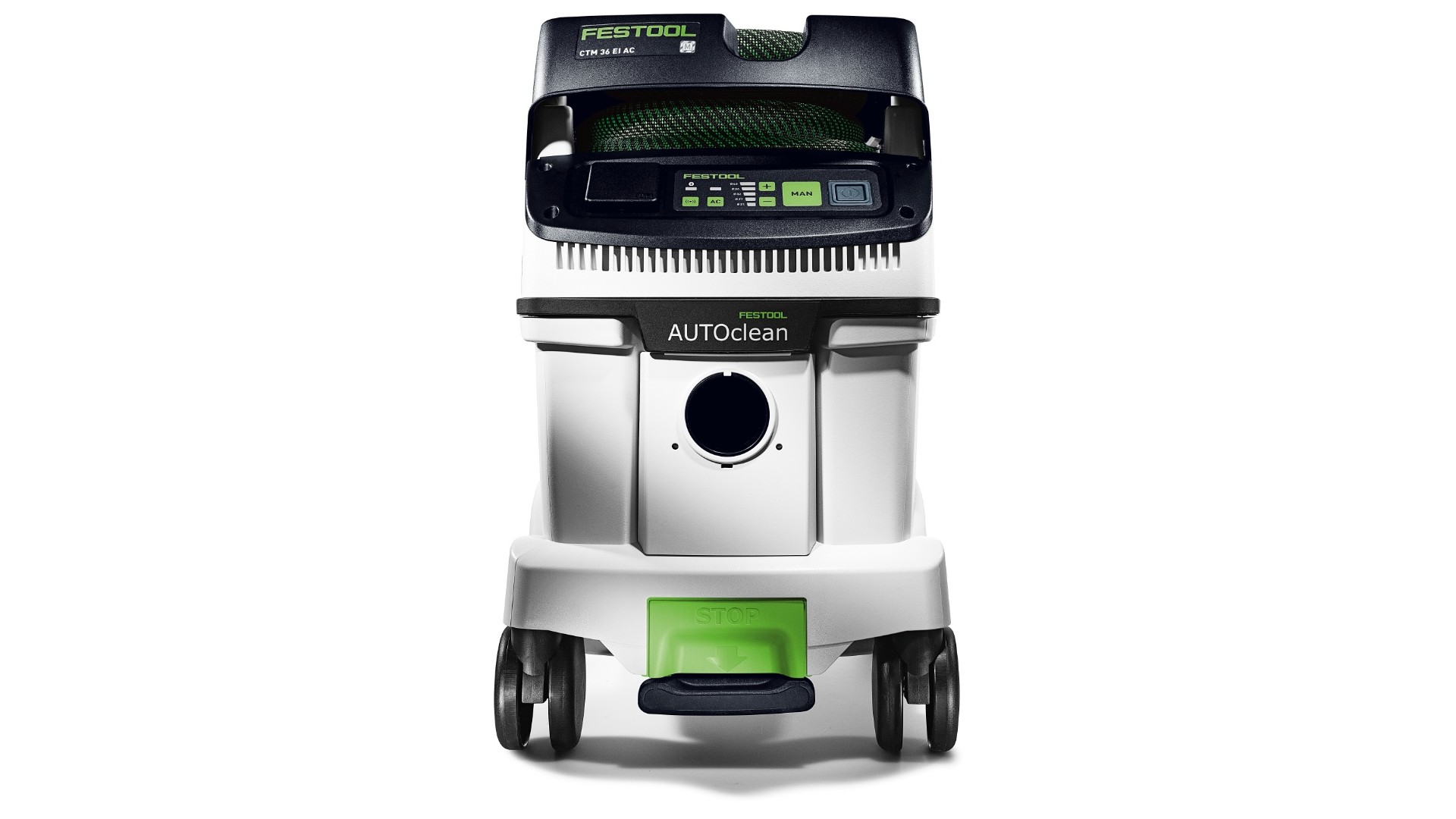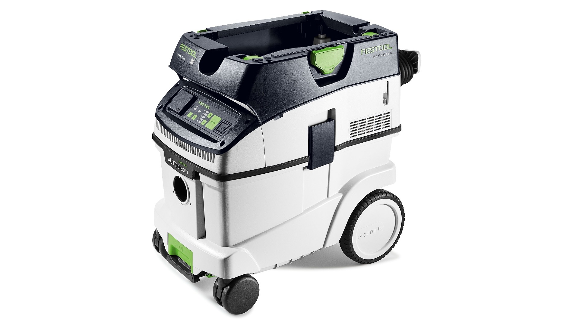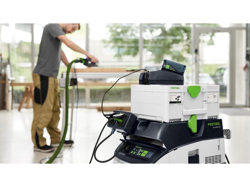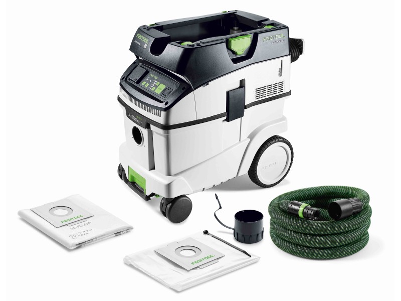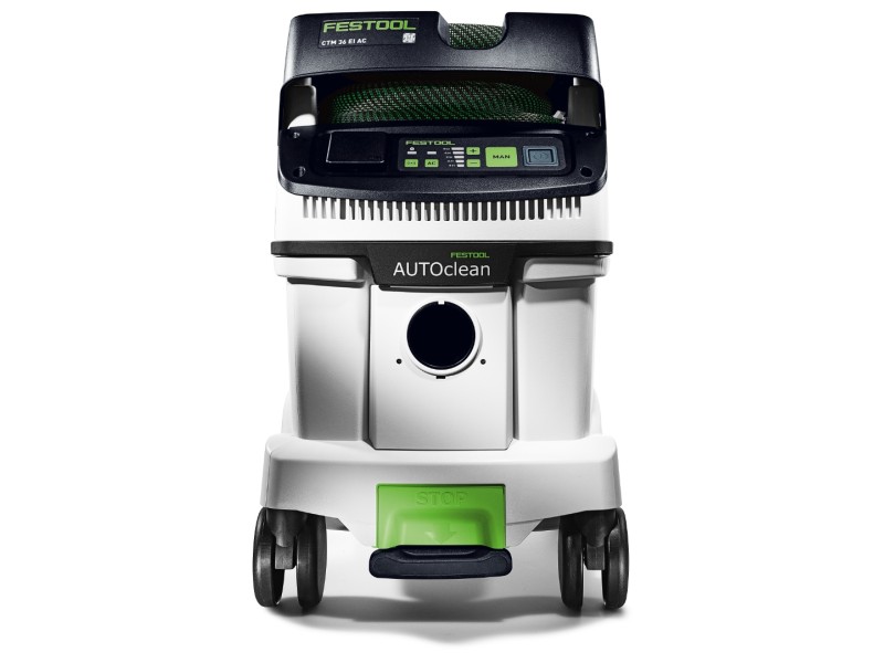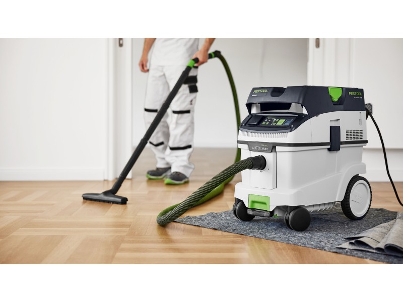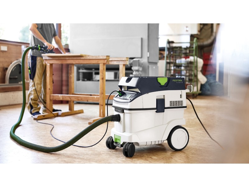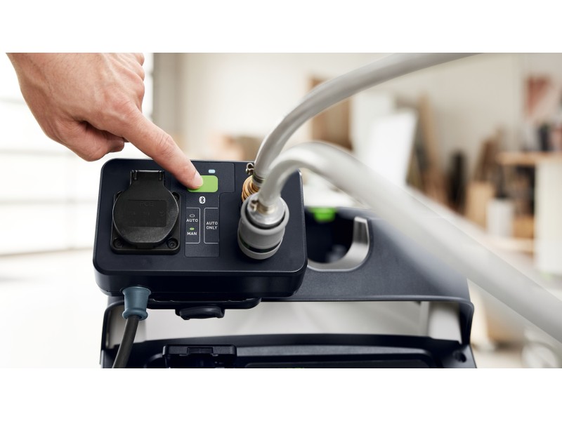 CLEANTEC CTM 36 EI AC отличается более эффективной, по сравнению с предшественником, автоматической очисткой основного фильтра AUTOCLEAN. Это обеспечивает стабильно высокую силу всасывания, более длительные рабочие интервалы и больший ресурс фильтра при меньших затратах на обслуживание. Сенсорное управление даёт интуитивный контроль пылесоса. Встроенный интерфейс Bluetooth® позволяет автоматически запускать пылесос от аккумуляторного инструмента Festool или опционального пульта ДУ. С пылесосом можно связаться и через приложение Festool App — в нём, например, настраиваются интервалы очистки. Гладкий антистатический шланг удобно убирается в интегрированный отсек для шланга.