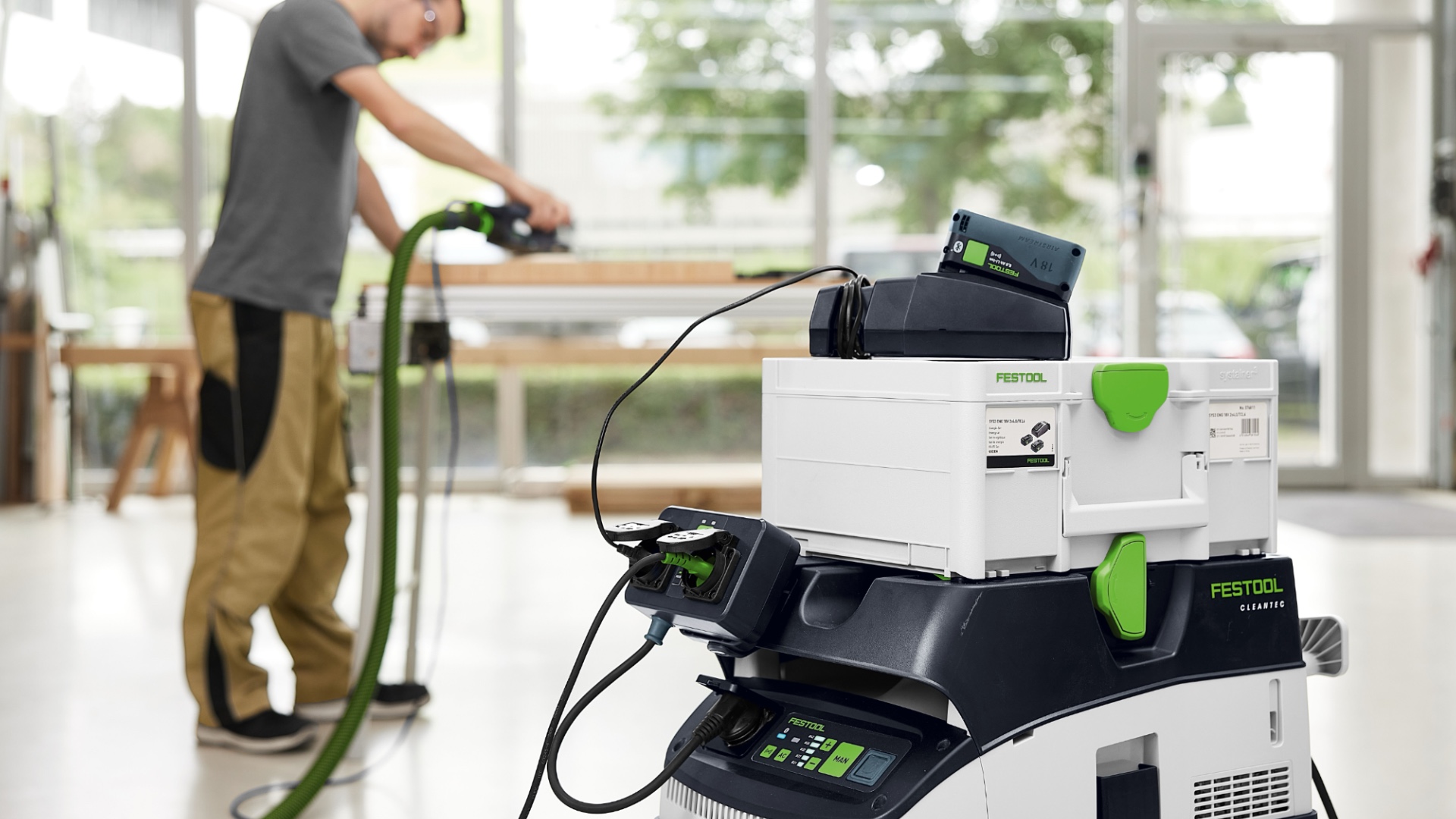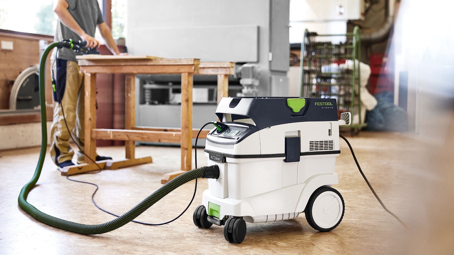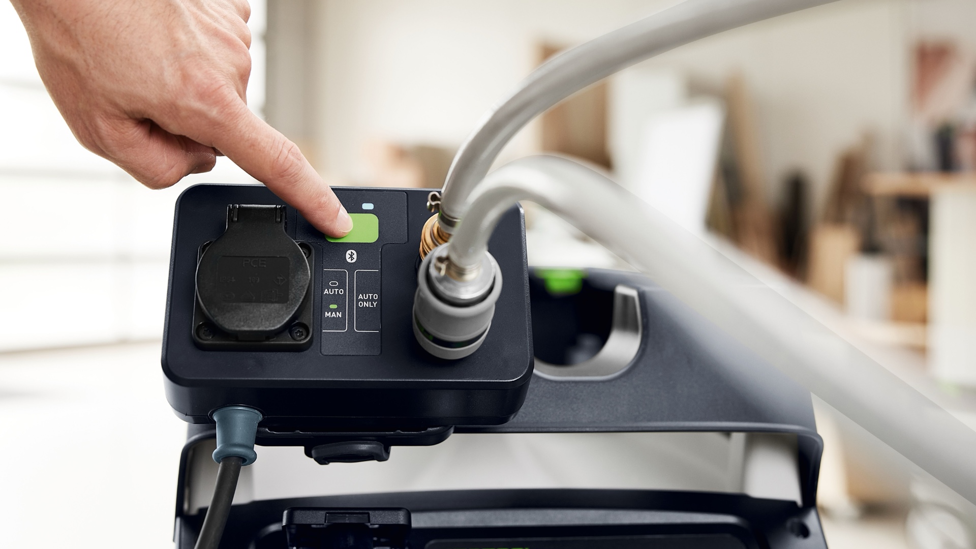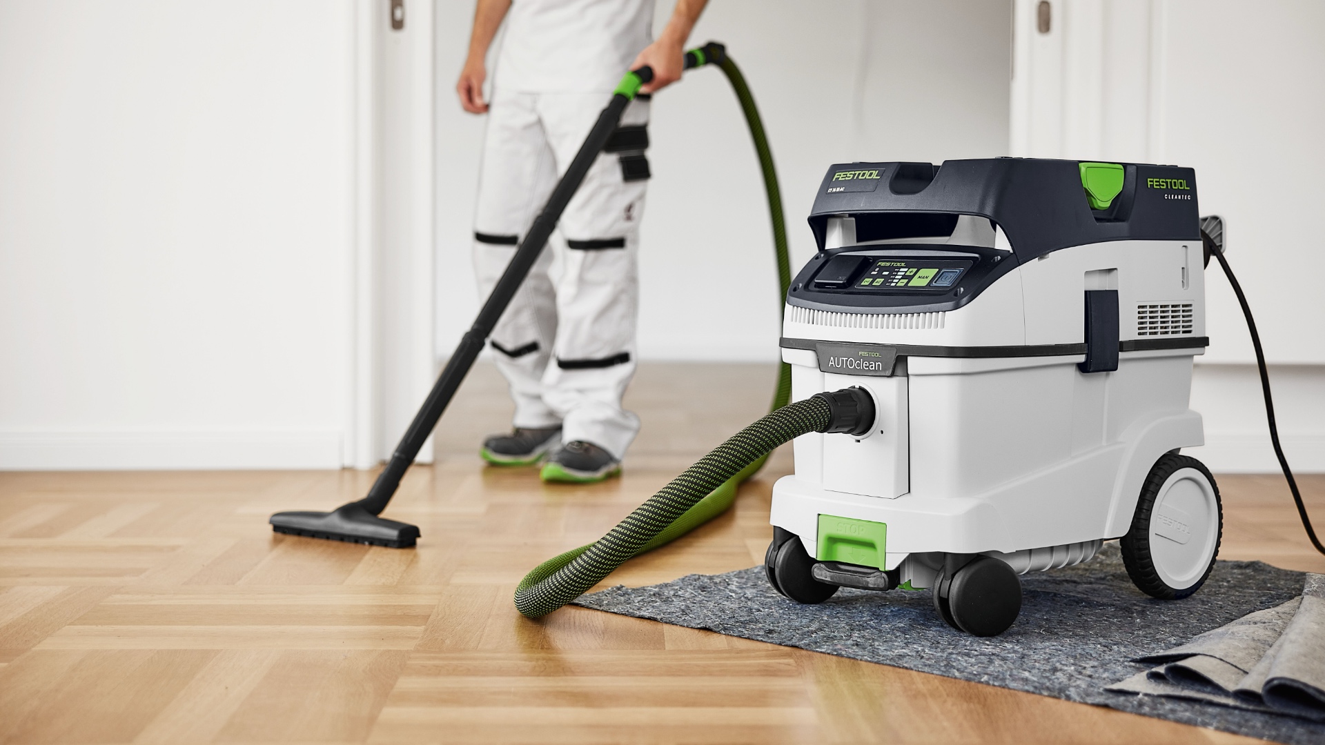 CLEANTEC CTM 36 EI AC отличается более эффективной, по сравнению с предшественником, автоматической очисткой основного фильтра AUTOCLEAN. Это обеспечивает стабильно высокую силу всасывания, более длительные рабочие интервалы и больший ресурс фильтра при меньших затратах на обслуживание. Сенсорное управление даёт интуитивный контроль пылесоса. Встроенный интерфейс Bluetooth® позволяет автоматически запускать пылесос от аккумуляторного инструмента Festool или опционального пульта ДУ. С пылесосом можно связаться и через приложение Festool App — в нём, например, настраиваются интервалы очистки. Гладкий антистатический шланг удобно убирается в интегрированный отсек для шланга.