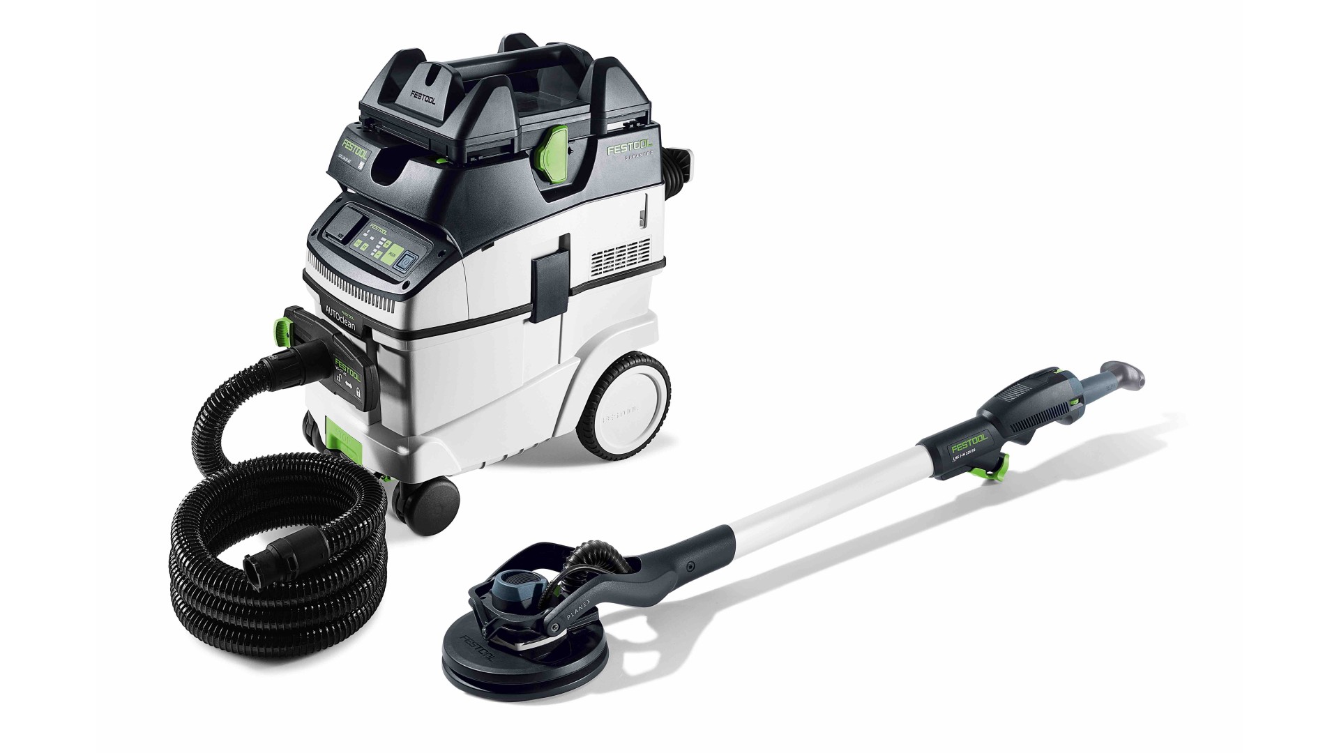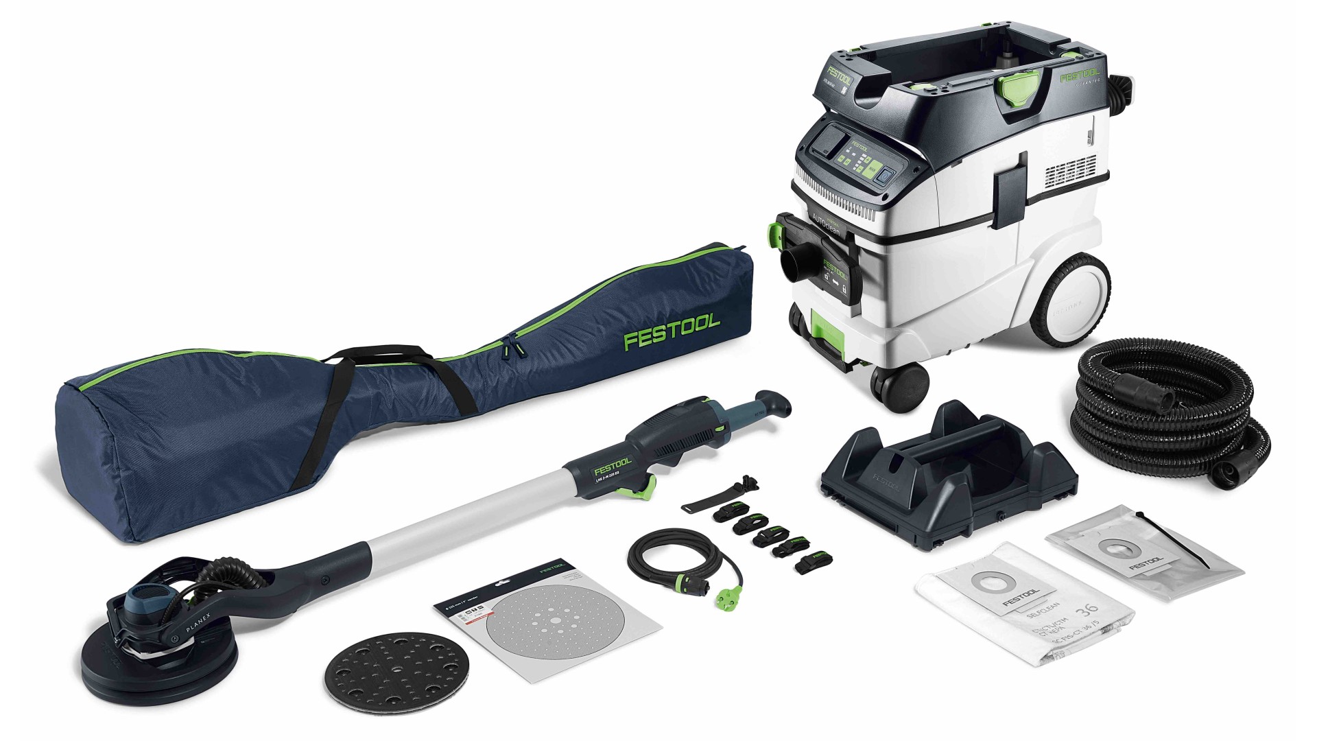 PLANEX M в комплекте с пылеудаляющим аппаратом CTL 36 - настоящий универсал среди наших шлифмашинок для стен и потолков. Просто достаём её из чехла, подключаем к электросети и приступаем к работе. Эксцентриковое движение шлифтарелки обеспечивает высокое качество обрабатываемой поверхности. Для облегчения работы можно отрегулировать прижим шлифтарелки к стене или потолку для снятия нагрузки с рук и спины. Инструмент имеет рабочую длину 1,4 м, которой хватает для всех типовых помещений. С помощью практичной T-образной рукоятки можно дополнительно увеличить зону действия шлифмашинки.