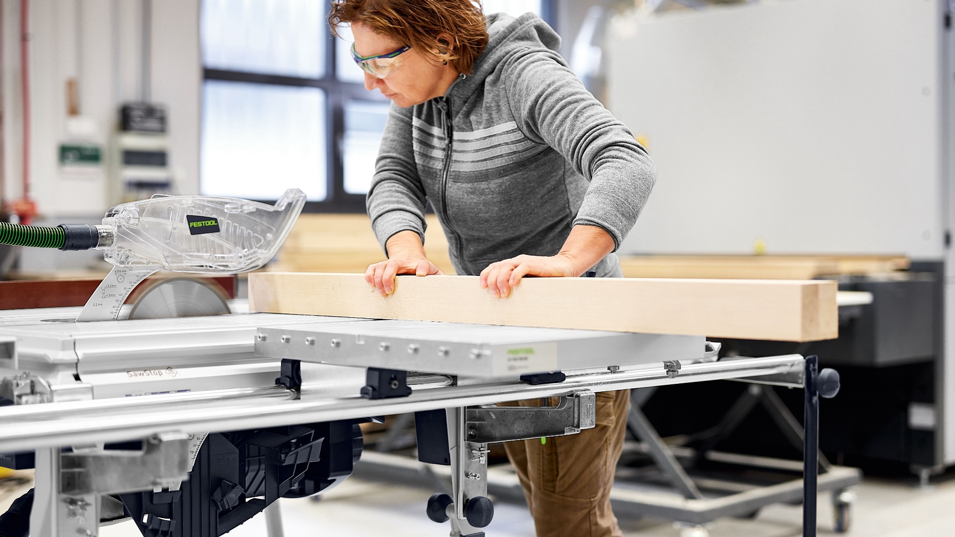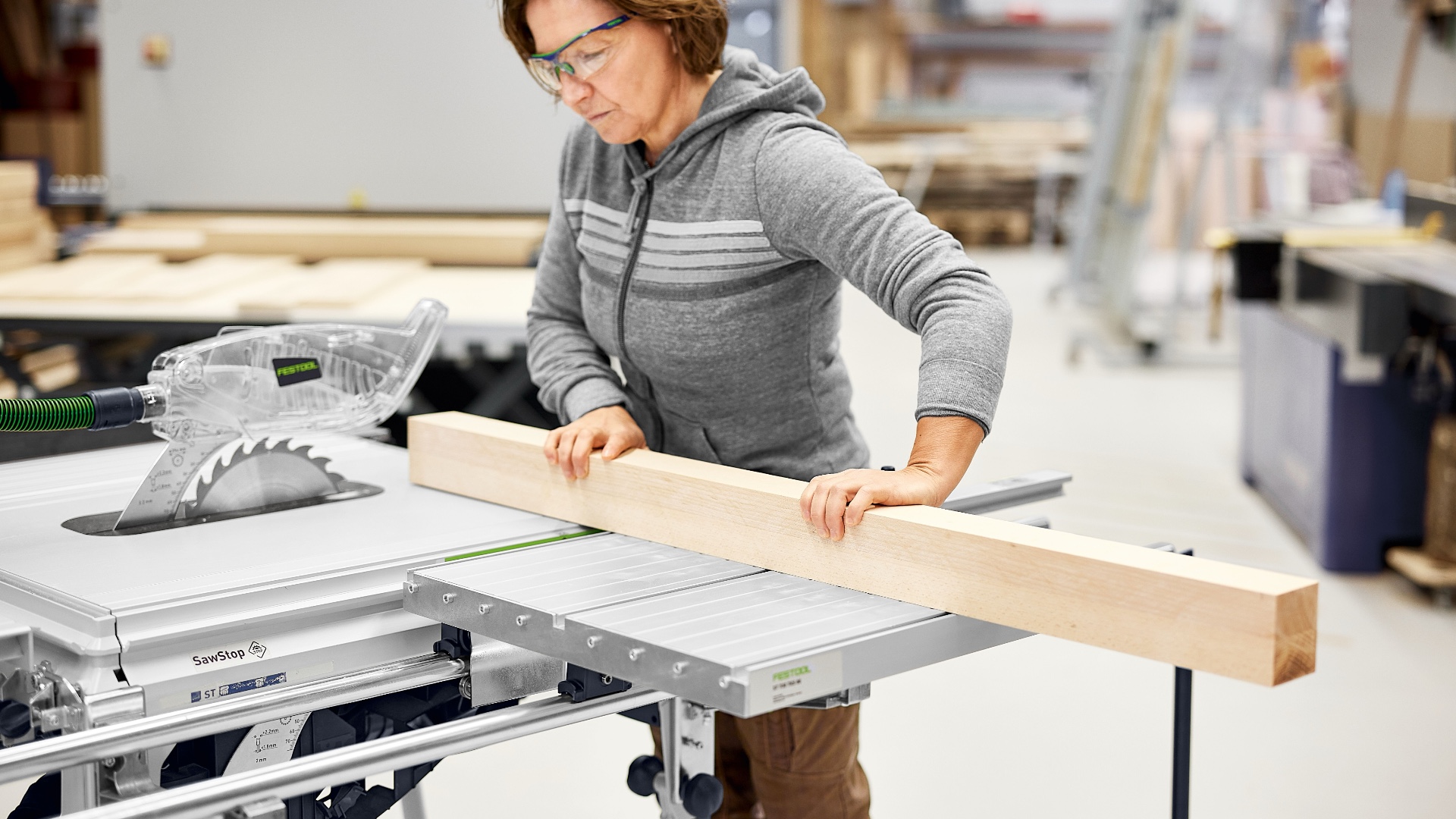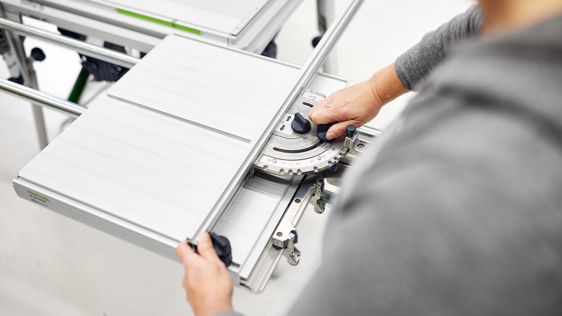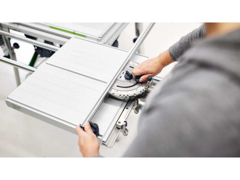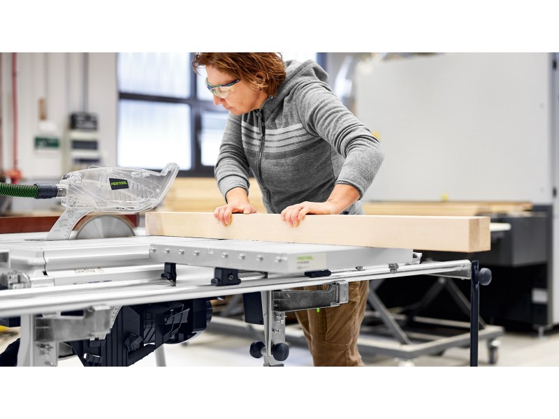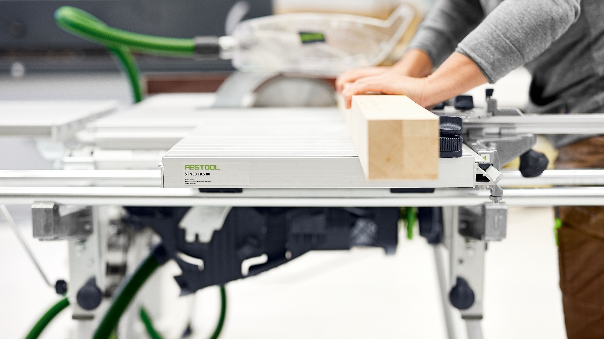 Просто протолкните крупные заготовки через пильный диск TKS 80 — готово! С удлинённым направляющим узлом вы точно и без усилий распиливаете крупноформатные листовые материалы. Одновременно скользящий стол служит дополнительным расширением с левой стороны настольной циркулярной пилы. С соответствующим угловым упором с фиксацией вы выполняете строго перпендикулярные резы и так же просто и точно настраиваете любые другие углы.
