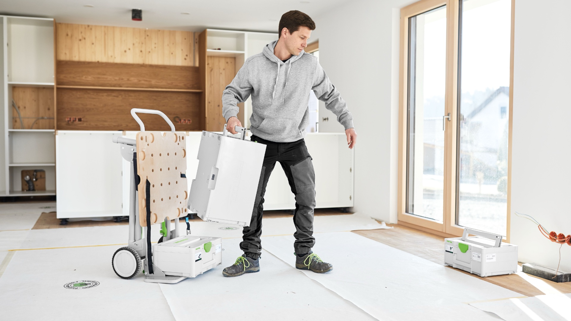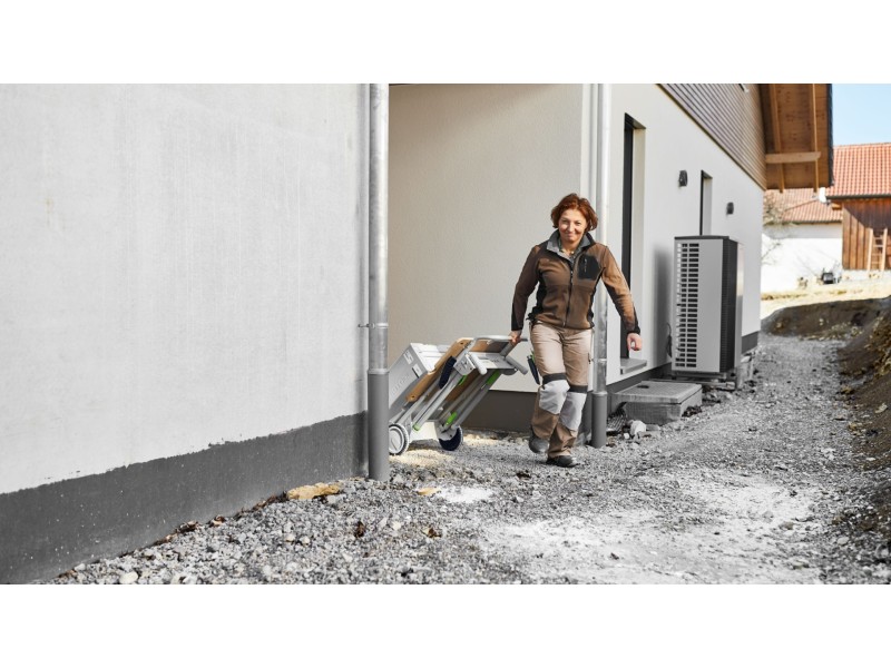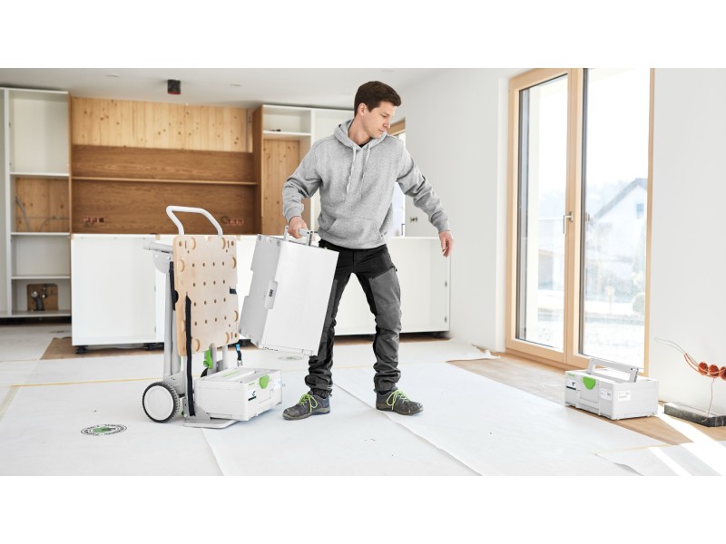 Подставка UG-CSC-SYS – это идеальное 3-в-1 решение для ваших монтажных работ. Для транспортировки от автомобиля к месту применения она используется как тележка – целую башню из систейнеров весом до 80 кг вы легко закатите на объект. В считанные секунды раскладываются откидные ножки, и у вас есть рабочий стол размером 58 × 58 см – практичная альтернатива козлам. Через перфорированную плиту заготовки надёжно зажимаются на поверхности. Но весь свой потенциал подставка раскрывает в сочетании с аккумуляторной настольной циркулярной пилой CSC SYS 50. Она надёжно позиционируется в отверстиях рабочей поверхности, и вы работаете на эргономичной высоте 90 см. Для работы аккумуляторной настольной пилой CSC SYS 50 у пола, например при укладке пола, ножки просто остаются сложенными. «Лопата», которая только что служила опорой для транспортировки систейнеров, теперь устанавливается вертикально и становится идеальной опорой для длинных заготовок при продольных, поперечных и угловых резах.