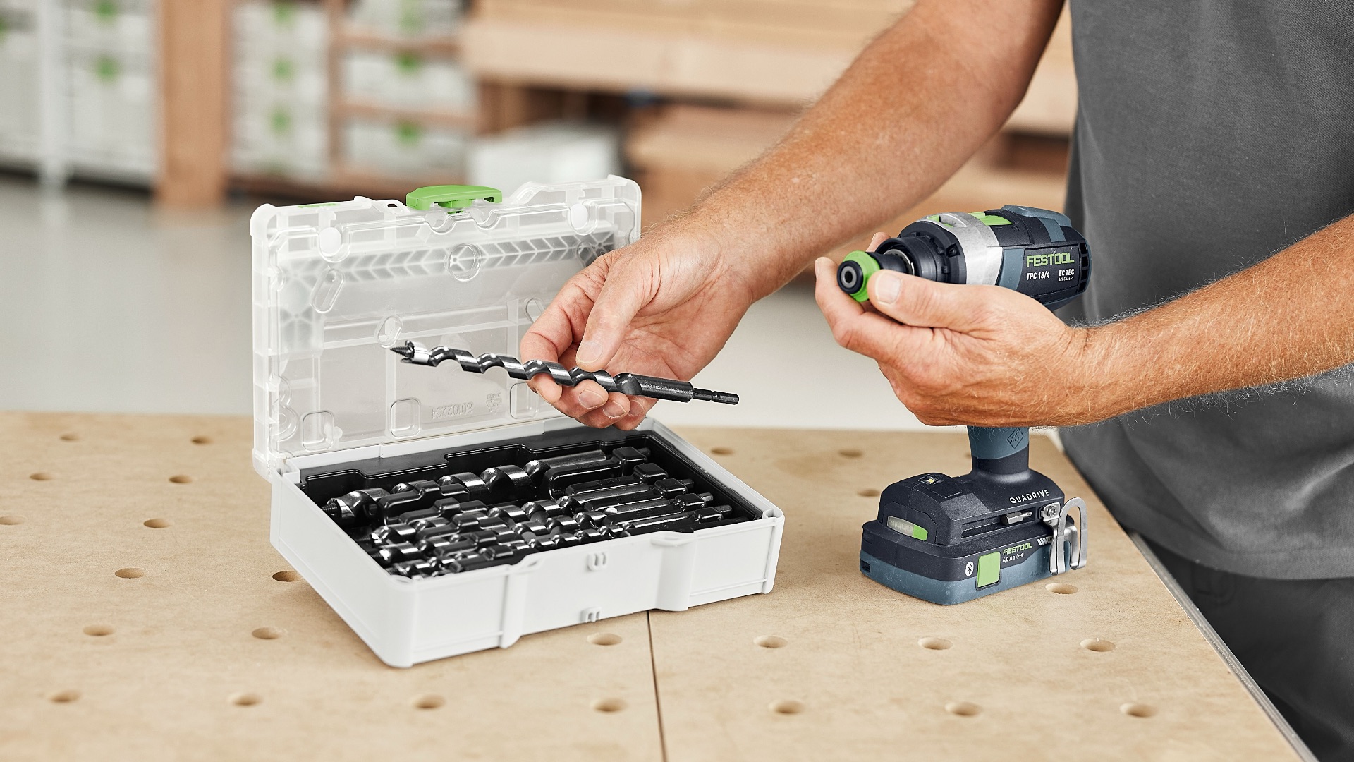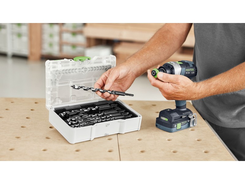 Для глубоких глухих и сквозных отверстий в мягкой и твёрдой древесине: шнековые сверла CENTROTEC обеспечивают точную обработку стропил и балок. Оптимально подобранный шаг резьбы обеспечивает идеальный отвод стружки. Прочная резьбовая острия позволяет точно позиционировать сверло и ввинчивает его в древесину, что уменьшает утомляемость при работе. Благодаря интерфейсу CENTROTEC шнековые сверла можно менять за считанные секунды. Дополнительно их можно перетачивать до пятнадцати раз — для быстрого рабочего прогресса и точных результатов сверления. Сверла аккуратно и безопасно хранятся в удобном Systainer³ S. И при этом остаются мобильными: с помощью Systainer³ Rack ваш Systainer с оснасткой можно интегрировать в систему оборудования автомобиля bott vario3.
