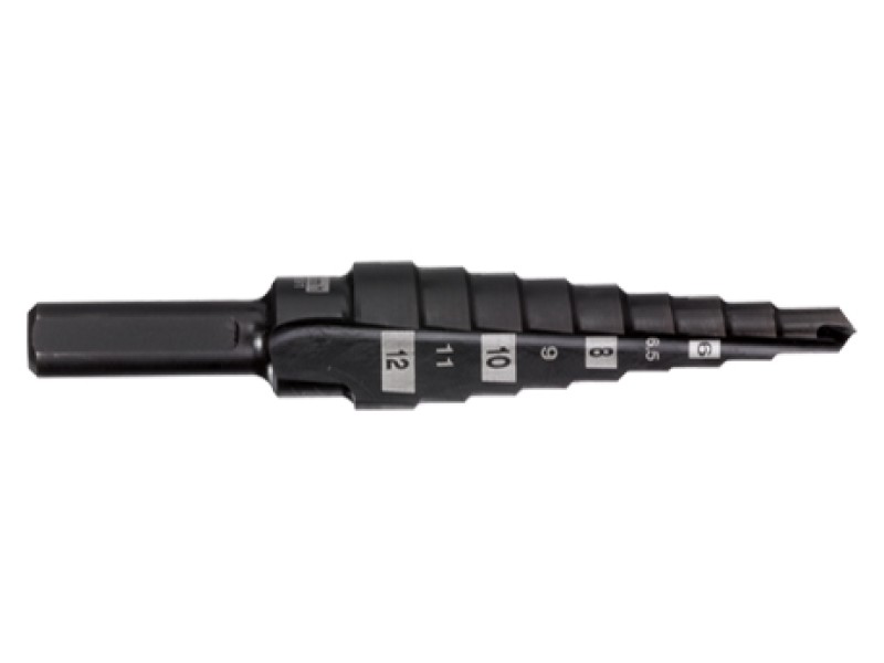 - Специальный наконечник и геометрия ступенчатого сверла - уменьшает риск закусывания сверла при использовании высокоскоростных аккумуляторных дрелей и так же защищает материал от деформации.