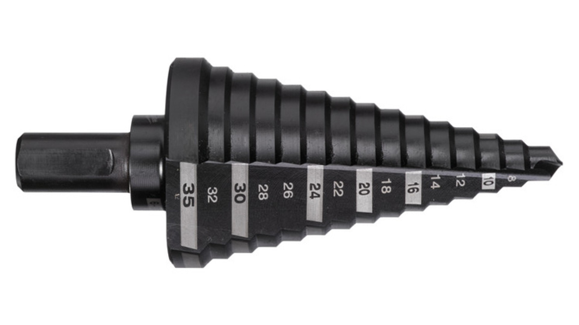 - Специальный наконечник и геометрия ступенчатого сверла - уменьшает риск закусывания сверла при использовании высокоскоростных аккумуляторных дрелей и так же защищает материал от деформации.