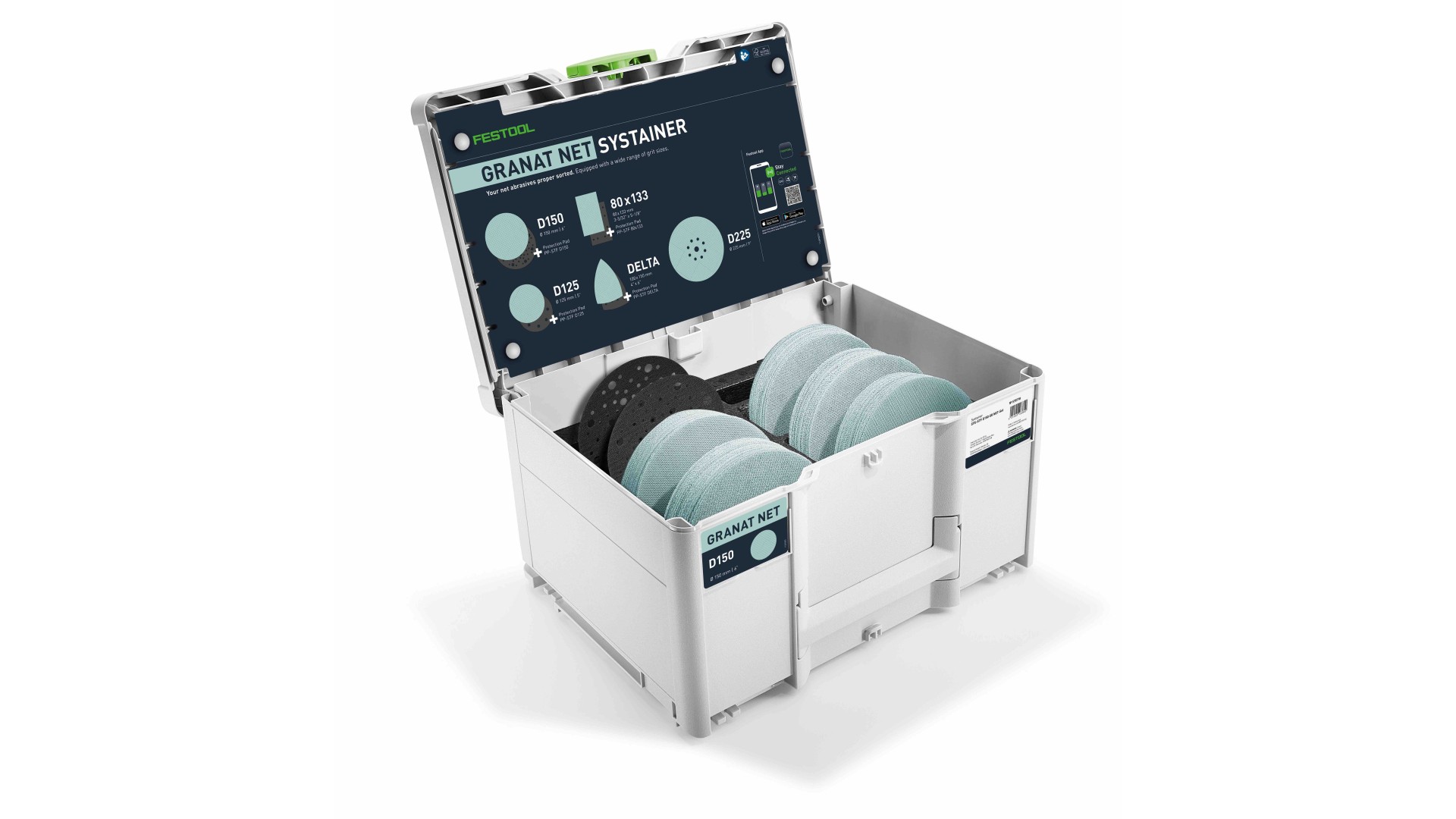 Шлифовальный Systainer — идеальное дополнение к вашей шлифмашине. Благодаря большому набору зернистостей он отлично подходит для знакомства с шлифматериалом Granat. 20 шлифкругов Granat зернистостью от P60 до P240, а также 2 защитные прокладки (Protection Pad) — всегда под рукой. Разумеется, внутри предусмотрена упорядоченная структура по зерну: у каждого отделения своё место, поэтому нужную зернистость можно найти буквально за секунды. Удобное пополнение позволяет всегда иметь под рукой именно тот абразив, который нужен.